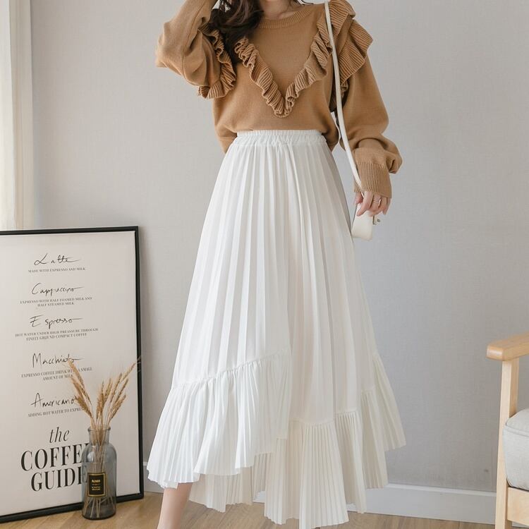 ボトムス スカート フレアスカート プリーツスカート ロング丈 プリーツ アシンメトリー ウエストゴム かわいい 大人可愛い きれいめ シンプル カジュアル 上品 おしゃれ かっこいい 大人女子 こなれ感 個性的 主役級 存在感 キュート ナチュラル ベーシック クール 無地 秋 冬 レディース 女性用 ママ OL 通勤 オフィス ビジネス 学生 通学 デート お出かけ お泊まり イベント 女子会 休日 カフェ ショッピング 旅行 リゾート コンパ レストラン 普段使い 着回し 脚長 ワンサイズ
