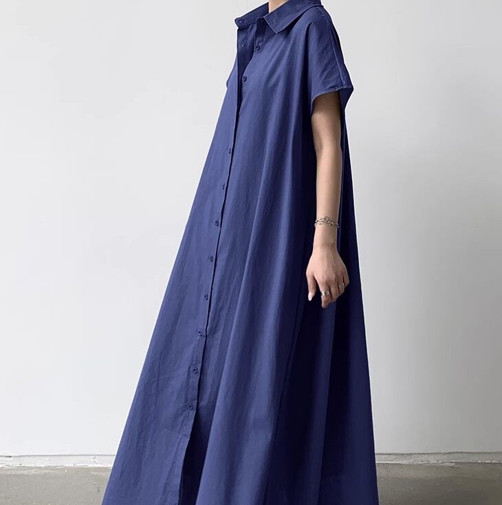 ワンピース レディース シャツワンピ フレア マキシ 半袖 Vネック 襟付き フェミニン リネン 綿 コットン 麻 かわいい 大人可愛い 上品 おしゃれ かっこいい ラフ ガーリー ルーズ 抜け感 ベーシック ナチュラル 無地 夏 デート お出かけ リゾート 旅行 女子会 休日 バカンス ショッピング カフェ アースカラー コーデ 普段使い 着回し S M L XL 2XL 小さいサイズ 大きいサイズ 茶色 ブラウン ブルー アプリコット ネイビー 緑 グリーン モスグリーン ベーシックカラー 大人カラー