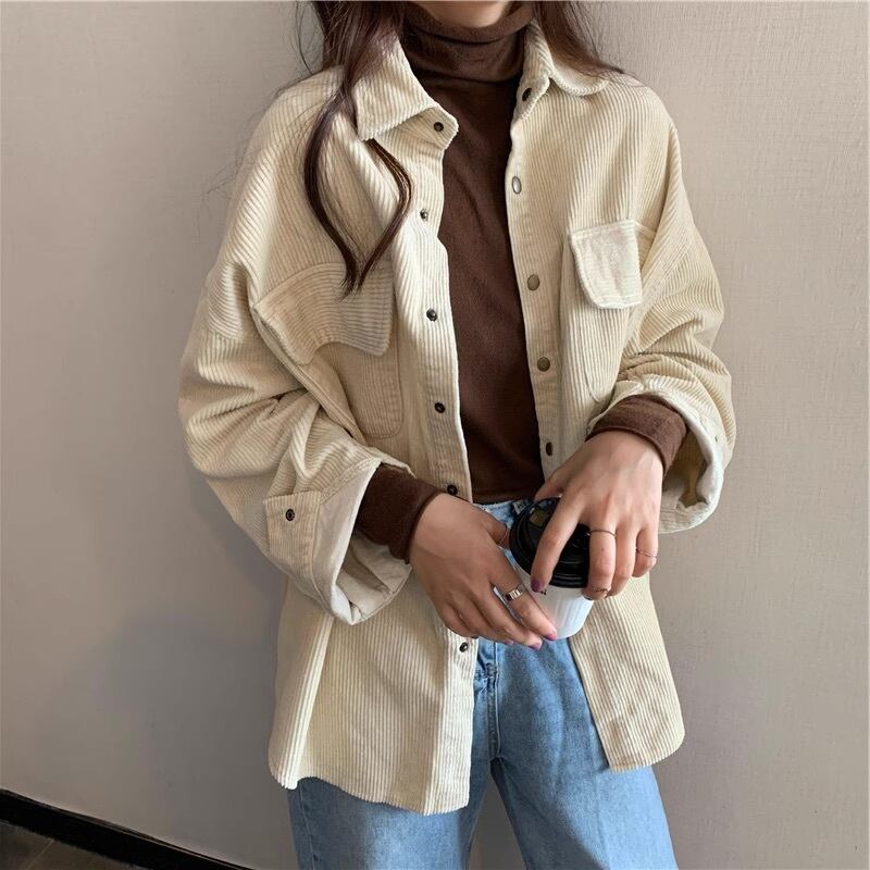 秋冬のおしゃれなアイテム!トレンド感たっぷりのVネックと襟付きが特徴の長袖シャツジャケット。ストリートからカレッジ風まで、幅広いスタイルにマッチするシンプルでかわいい一着。コーデュロイ素材がこなれ感を演出し、ラフな抜け感も◎。学生風からアクティブまで、学校や通学から女子会、休日のショッピングまで活躍。MからXLまでのサイズ展開で、ブラウン、アプリコットなどベーシックカラーでコーディネートも楽ちん。重ね着やレイヤードで着回し自在で、モテ度抜群でインスタ映えもばっちり。定番のアイテムとして、普段使いに最適な一着です!