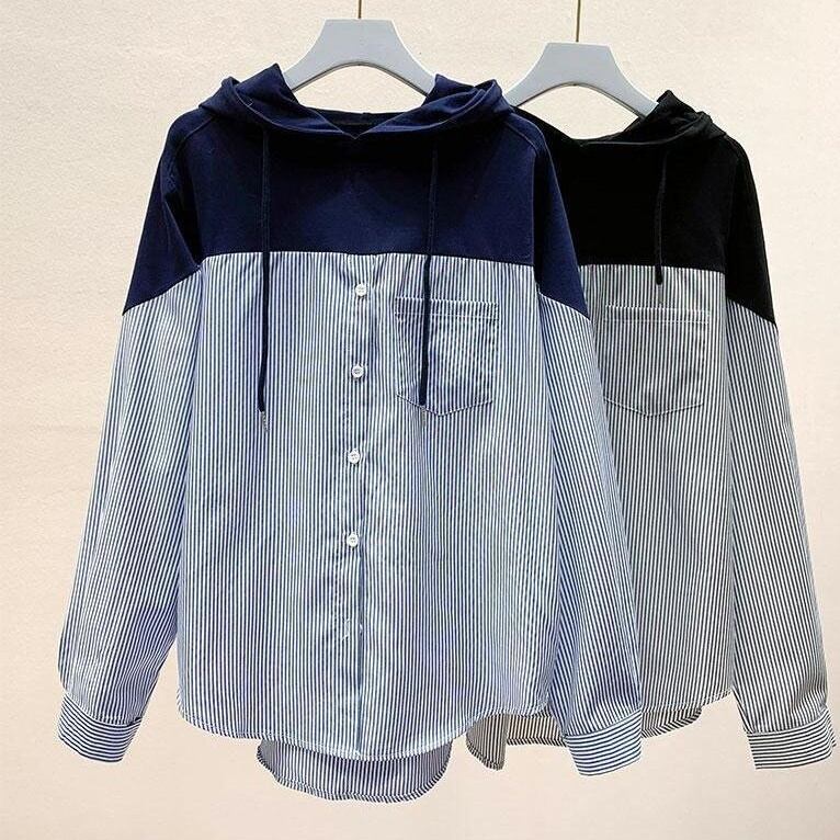 トップス シャツ 長袖 ミディアム丈 フード付き 切り替えデザイン 胸ポケット かわいい 大人可愛い きれいめ シンプル 上品 おしゃれ かっこいい レトロ ラフ ルーズ こなれ感 個性的 主役級 レトロ 存在感 抜け感 オールシーズン キュート クール ナチュラル ベーシック ストライプ柄 レディース 女性用 ママ OL 通勤 オフィス ビジネス 学生 通学 デート お出かけ お泊まり イベント 女子会 休日 カフェ ショッピング 旅行 レストラン コンパ 重ね着 普段使い 着回し S M L XL