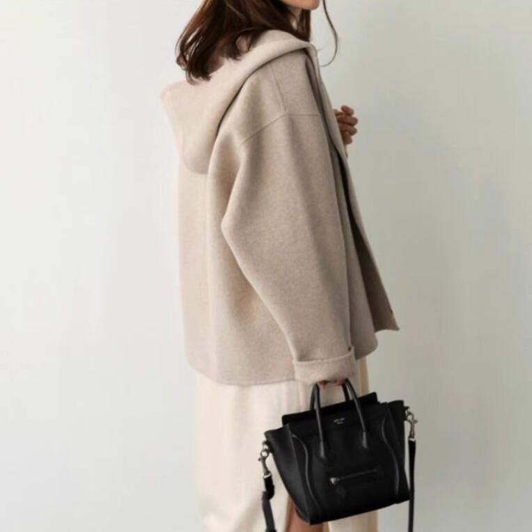 とろみ感のあるフード付きのウールショートコート