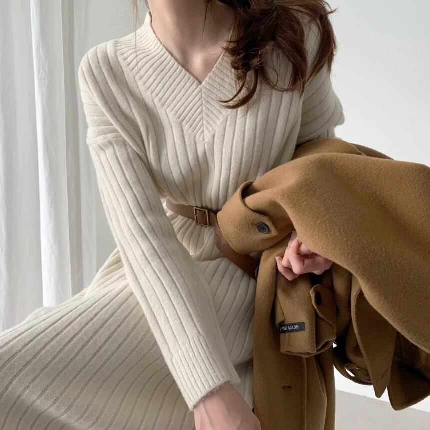 ワンピース レディース ニットワンピ ミモレ 長袖 Vネック Iライン フェミニン リブニット ニット かわいい 大人可愛い きれいめ シンプル おしゃれ こなれ感 ラフ ガーリー ルーズ 抜け感 ラブリー キュート アクティブ ナチュラル 無地 秋 冬 デート お出かけ 女子会 休日 カフェ ショッピング 重ね着 普段使い 着回し モテ 清楚 トレンド 流行 インスタ映え 定番 S M L XL 2XL 小さいサイズ 大きいサイズ 白 ホワイト 黒 ブラック 茶色 ブラウン グレー アプリコット