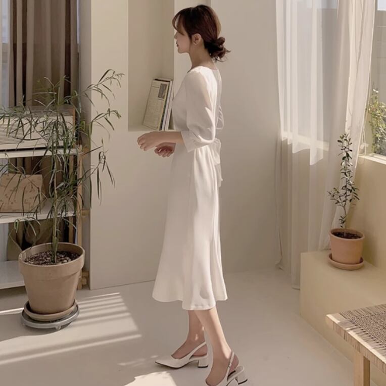 スカート ワンピース プルオーバー ドレス レディース フレアスカート ロングスカート ミモレ 7分袖 スクエアネック 襟なし ノーカラー フレア スリム 細身 リボン ウエストマーク ウエストリボン ハイウエスト 薄手 かわいい 大人可愛い きれいめ シンプル 上品 おしゃれ レトロ こなれ感 個性的 クール モード系 エレガント モダン 主役級 存在感 フォーマル とろみ感 抜け感 ラブリー キュート ベーシック ロマンティック ナチュラル 無地 春 夏 デート お出かけ パーティー イベント 清楚