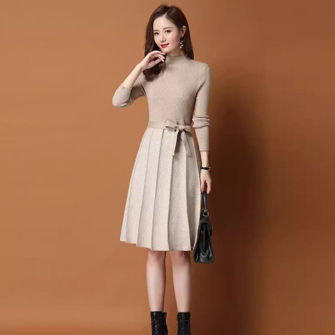 スカート ワンピース ニット セーター プルオーバー ドレス レディース プリーツスカート 膝丈 長袖 ハイネック スリム 細身 スマート プリーツ リボン ウエストリボン ハイウエスト かわいい 大人可愛い きれいめ シンプル カジュアル 上品 おしゃれ かっこいい レトロ アジアン こなれ感 ラフ 個性的 エレガント モダン 主役級 存在感 とろみ感 抜け感 ラブリー キュート ベーシック ロマンティック 秋 冬 デート お出かけ レストラン ホテル 合コン 婚活 コーデ 美脚 脚長 モテ 清楚