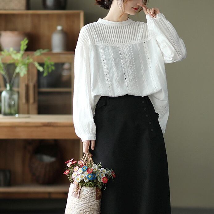 トップス ブラウス プルオーバー ミディアム丈 長袖 クルーネック 切り替えデザイン 透かし編み かわいい 大人可愛い きれいめ シンプル 上品 おしゃれ かっこいい レトロ ラフ ルーズ こなれ感 個性的 主役級 存在感 抜け感 春 夏 キュート ナチュラル ベーシック 無地 レディース 女性用 ママ マタニティ OL 通勤 学生 通学 デート お出かけ お泊まり イベント 女子会 休日 カフェ ショッピング 旅行 リゾート レストラン コンパ レイヤード 重ね着 普段使い 着回し ワンサイズ