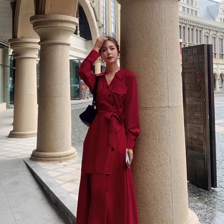 スカート プルオーバー ドレス レディース シャツワンピ フレアスカート ロングスカート ミモレ 長袖 Vネック 襟付き アシンメトリー リボン ウエストマーク ウエストリボン ポケット ハイウエスト 異国風 ボタン 薄手 かわいい 大人可愛い きれいめ カジュアル 上品 おしゃれ かっこいい レトロ アジアン こなれ感 ラフ ルーズ 個性的 クール モード系 エレガント モダン 主役級 存在感 とろみ感 抜け感 ラブリー キュート 都会的 ロマンティック 無地 春 秋 デート お出かけ 休日 美脚 脚長