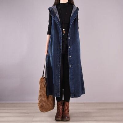 アウター ベスト デニムベスト ロング丈 袖なし 前開き ボタン フード付き ポケット デニム かわいい 大人可愛い きれいめ シンプル 上品 おしゃれ かっこいい レトロ ラフ こなれ感 個性的 主役級 存在感 抜け感 オールシーズン メンズライク キュート ナチュラル ベーシック クール 無地 レディース 女性用 ママ マタニティ OL 通勤 学生 通学 デート お出かけ お泊まり イベント 女子会 休日 カフェ ショッピング 旅行 アウトドア レストラン コンパ 普段使い 着回し L XL