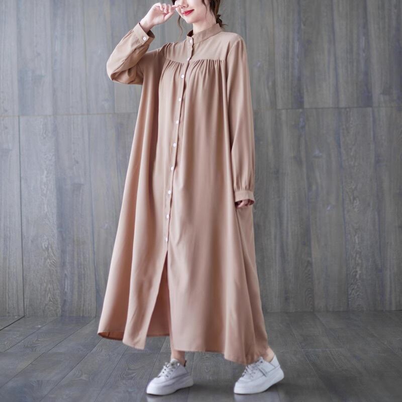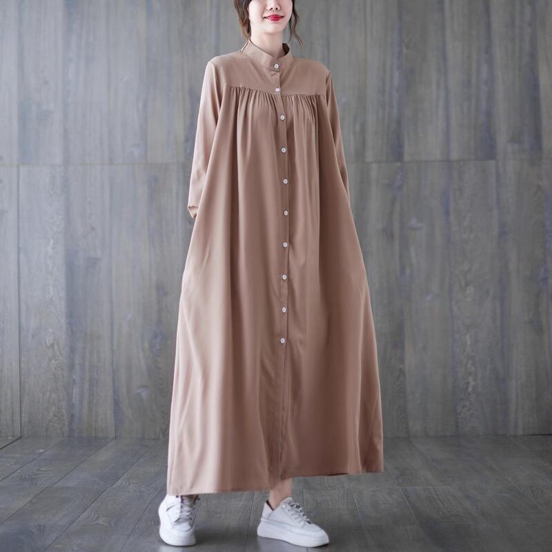ワンピース レディース シャツワンピ フレア マキシ 長袖 スタンドカラー フレア Aライン オーバーサイズ フェミニン 前開き かわいい 大人可愛い きれいめ シンプル カジュアル こなれ感 ラフ ベーシック ナチュラル 無地 春 秋 デート お出かけ 旅行 女子会 休日 お花見 カフェ 重ね着 楽ちん 普段使い 着回し トレンド 流行 インスタ映え 定番 ゆったり ゆる フリーサイズ 黒 ブラック 茶色 ブラウン グレー ベージュ 水色 ブルー レッド アプリコット 緑 グリーン ベーシックカラー