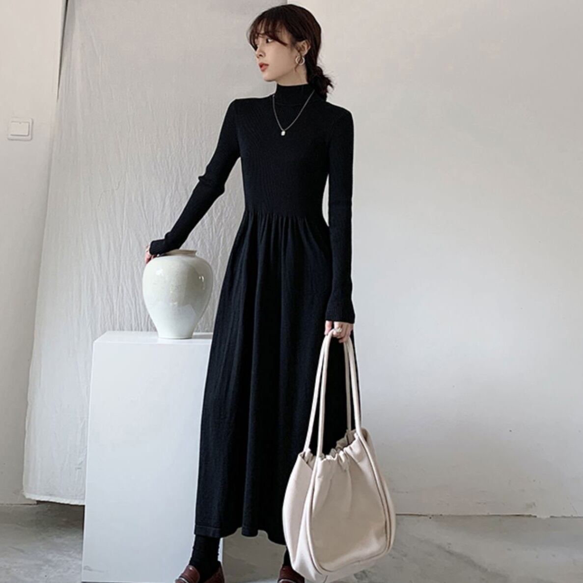 上品なタートルネックとウエストマークが女性らしいスタイルを演出し、フレアスカートが軽やかな動きを与えます。