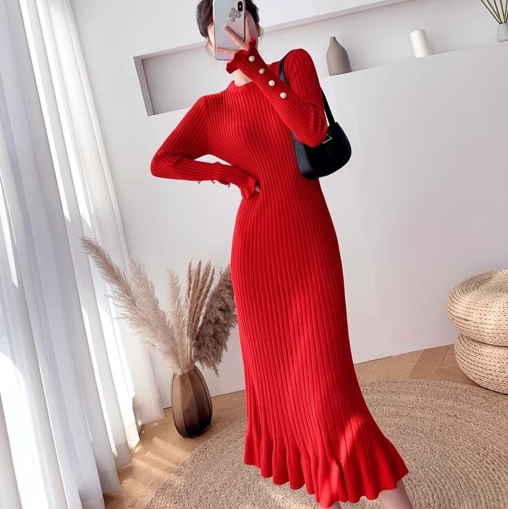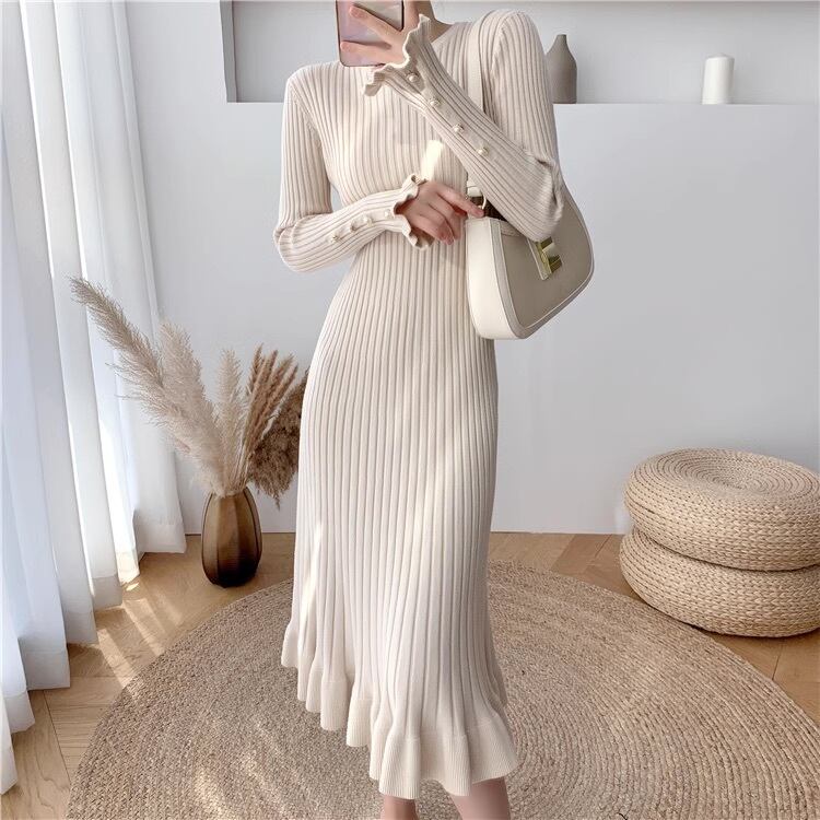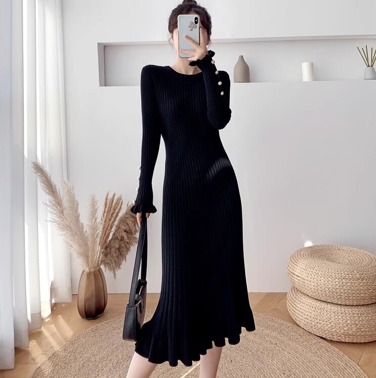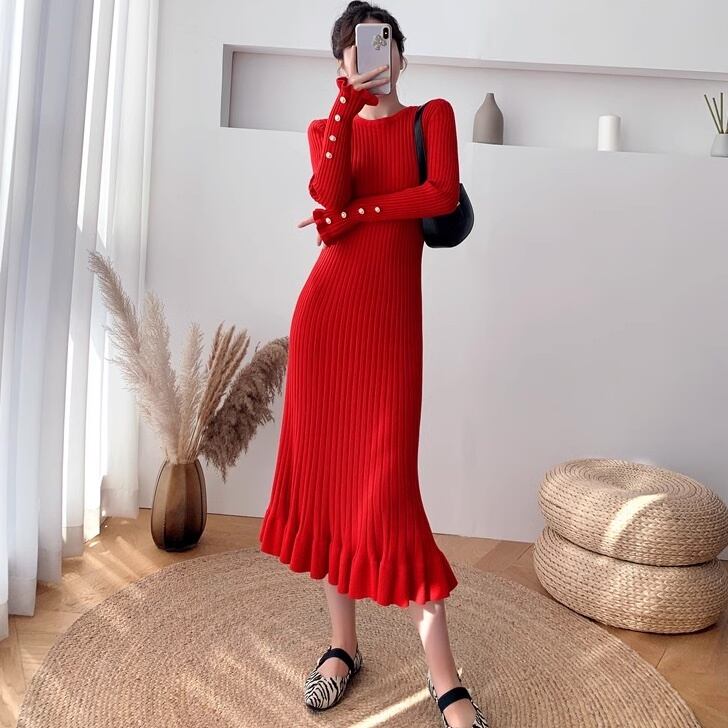 ワンピース レディース フレア ニットワンピ 膝下 長袖 フリル袖 ラウンドネック フェミニン フリル リブニット ニット かわいい 大人可愛い きれいめ おしゃれ ガーリー エレガント モダン ラブリー キュート ベーシック ロマンティック ナチュラル 無地 秋 冬 デート お出かけ パーティー イベント 女子会 休日 ショッピング カフェ 普段使い 着回し レイヤード モテ トレンド 流行 インスタ映え S M L XL 小さいサイズ 大きいサイズ 黒 ブラック レッド アプリコット ベーシックカラー