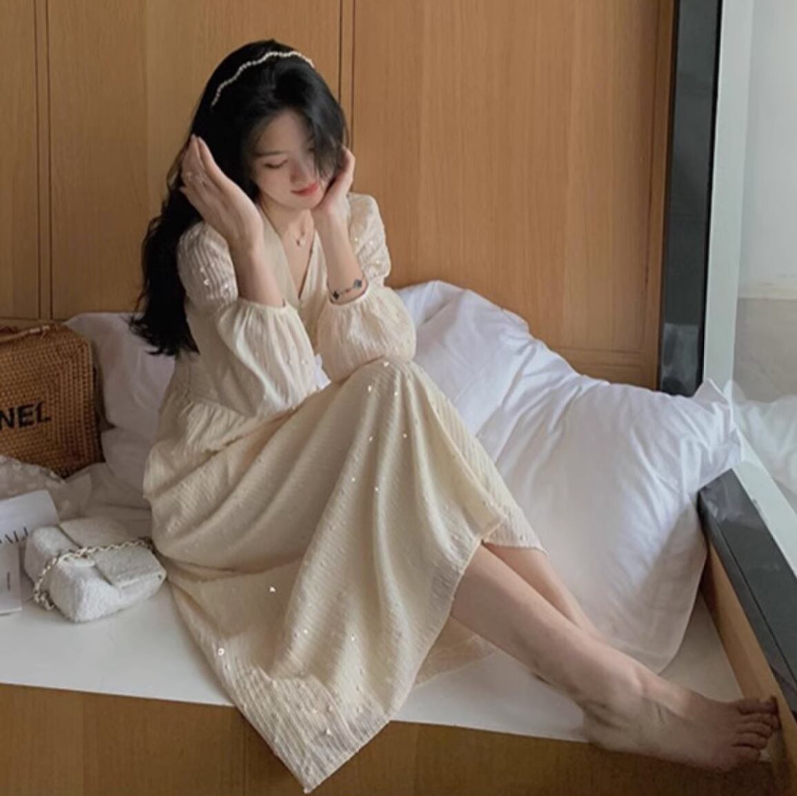ワンピース レディース フレア ロング 長袖 バルーン袖 Vネック フェミニン シフォン ウエストマーク ハイウエスト かわいい 大人可愛い きれいめ シンプル 上品 おしゃれ かっこいい こなれ感 ガーリー ラブリー キュート ラグジュアリー クラシカル ロマンティック 無地 春 秋 デート お出かけ 女子会 休日 合コン コンパ カフェ 婚活 コーデ 楽ちん 普段使い 着回し レイヤード モテ 清楚 トレンド 流行 インスタ映え 定番 S M L 小さいサイズ 大きいサイズ アプリコット キラキラ