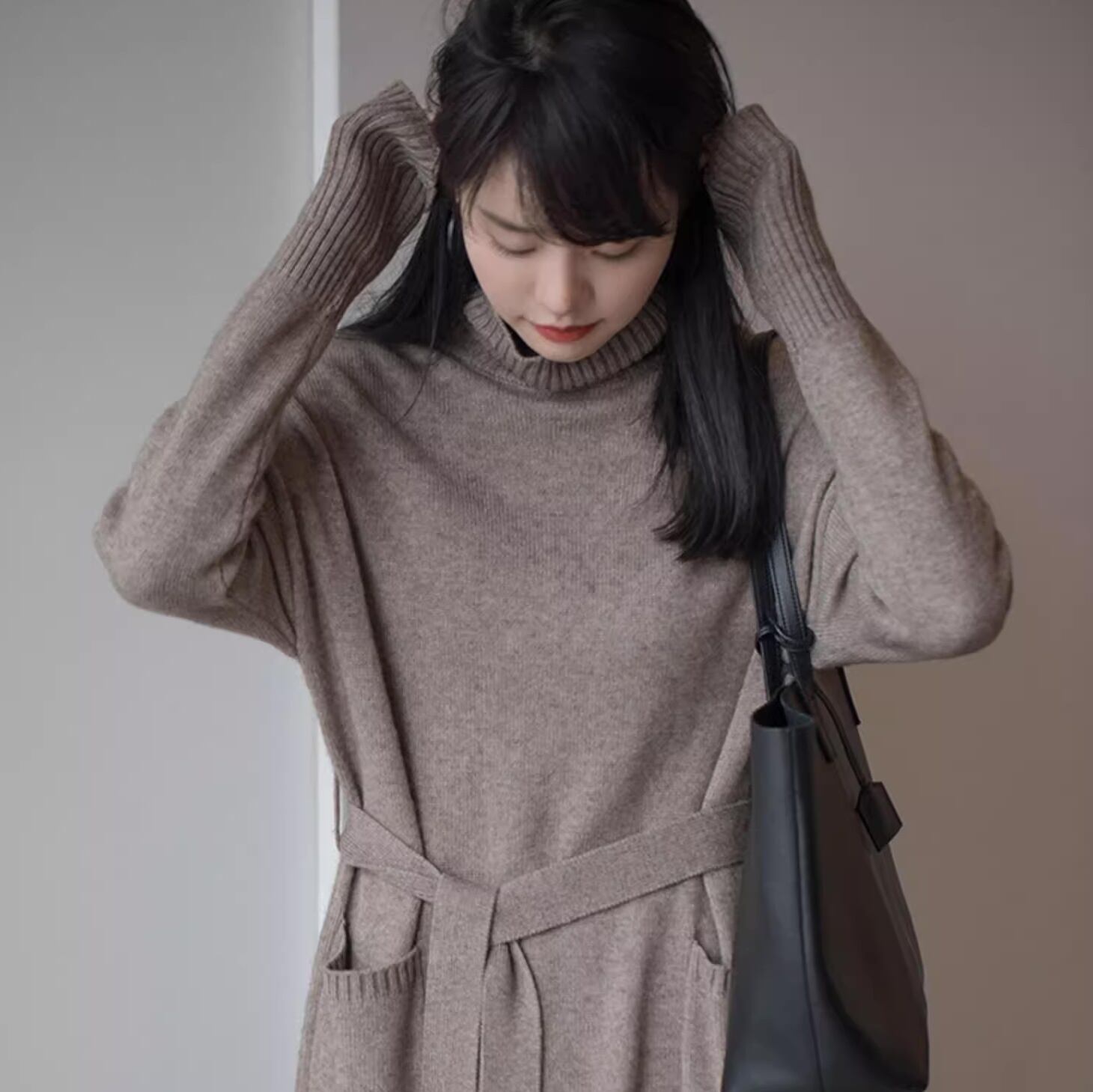 ワンピース レディース ニットワンピ ロング 長袖 ハイネック タートルネック ポケット フェミニン ウエストマーク ウエストリボン ベルト付き かわいい 大人可愛い きれいめ シンプル 上品 おしゃれ かっこいい こなれ感 エレガント モダン とろみ感 抜け感 ラブリー キュート ベーシック カントリー アクティブ ナチュラル 無地 秋 冬 お出かけ イベント 休日 カフェ 重ね着 普段使い 着回し レイヤード トレンド 流行 インスタ映え 定番 フリーサイズ 黒 ブラック グレー ピンク 大人カラー