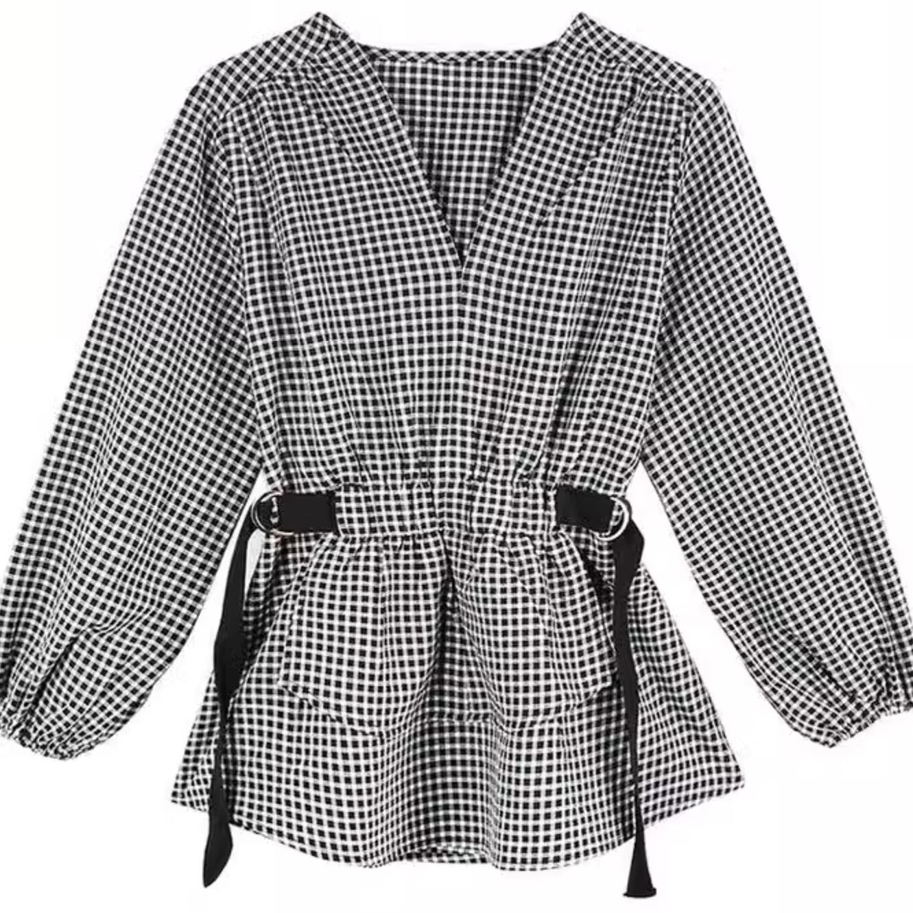 トップス シャツ ブラウス レディース 長袖 ボリューム袖 Vネック フェミニン フリル ウエストマーク ギャザー 大人可愛い きれいめ シンプル カジュアル おしゃれ かっこいい こなれ感 ガーリー 存在感 ラブリー キュート ベーシック ロマンティック ナチュラル チェック 格子柄 ギンガムチェック 春 秋 学生 学校 通学 デート お出かけ イベント レストラン 女子会 休日 カフェ ショッピング 体型カバー 普段使い 着回し レイヤード トレンド 流行 インスタ映え 定番 S M 黒 ブラック