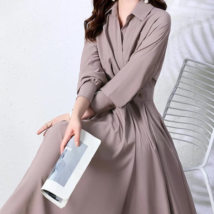 ワンピース レディース シャツワンピース ロング 長袖 Vネック 襟付き フレア Aライン プリーツ ウエストマーク かわいい 大人可愛い きれいめ シンプル カジュアル 上品 おしゃれ こなれ感 ラブリー キュート ガーリー 個性的 エレガント モダン 抜け感 フェミニン アクティブ ナチュラル 無地 春 秋 学生 お出かけ 休日 旅行 ショッピング カフェ 女子会 着回し 普段使い 重ね着 定番 トレンド 流行 インスタ映え M L XL 2XL 3XL グレー ベージュ ピンク くすみカラー