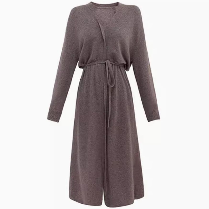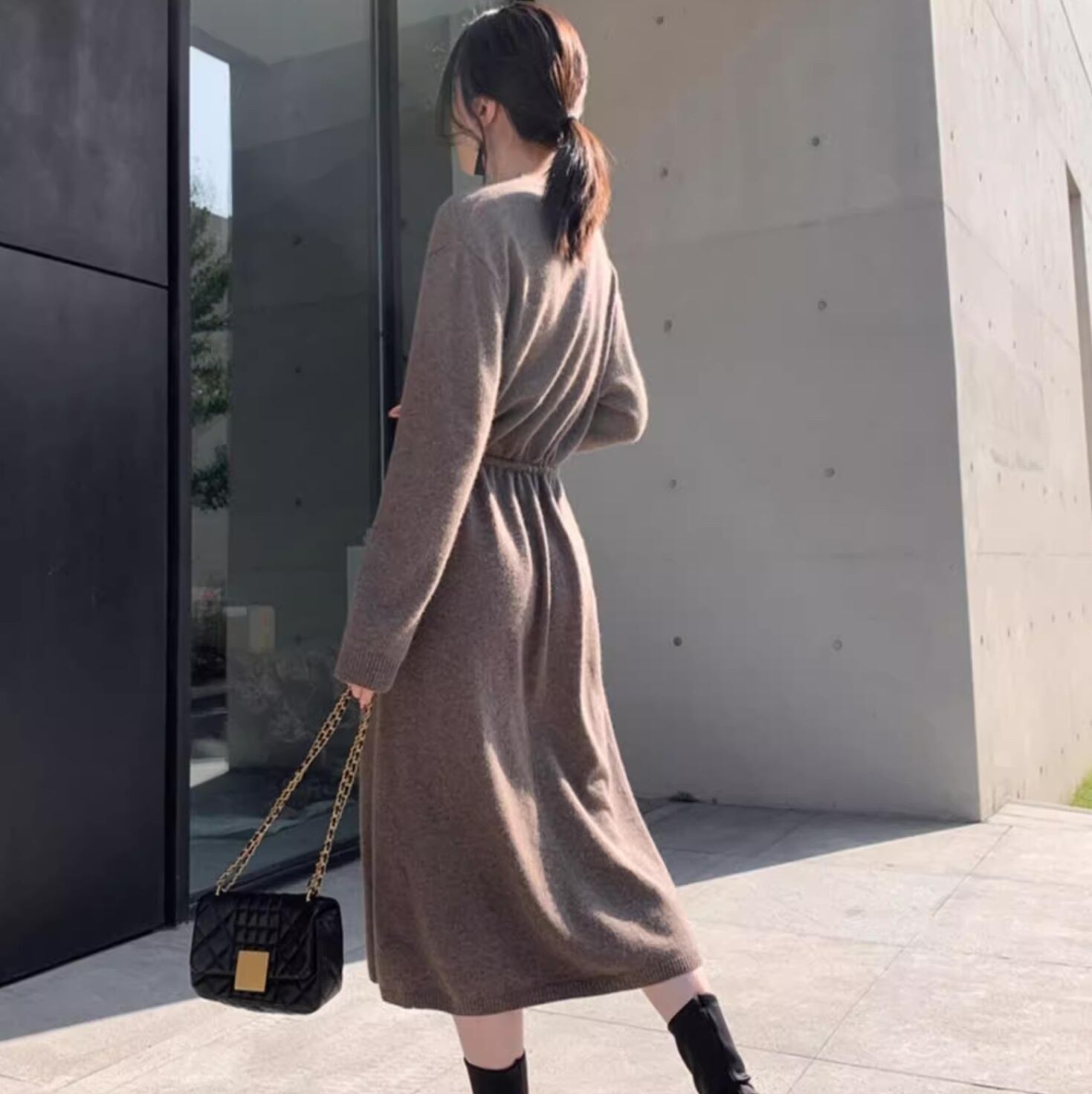 ワンピース レディース ニットワンピ ロング 長袖 Vネック 襟付き フェミニン ウエストマーク ウエストリボン ハイウエスト ニット かわいい 大人可愛い きれいめ シンプル おしゃれ かっこいい こなれ感 ラフ ガーリー ルーズ モダン キュート ベーシック ロマンティック ナチュラル 無地 秋 冬 デート お出かけ 旅行 女子会 休日 カフェ 重ね着 普段使い 着回し レイヤード トレンド 流行 インスタ映え S M L 小さいサイズ 大きいサイズ 茶色 ブラウン アプリコット ベーシックカラー