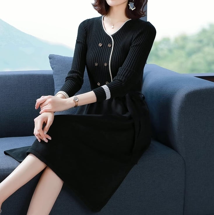 ワンピース レディース ニットワンピ 膝丈 長袖 Vネック フレア Aライン フェミニン ウエストマーク ウエストリボン ハイウエスト ニット かわいい 大人可愛い きれいめ 上品 おしゃれ レトロ ガーリー エレガント モダン キュート 都会的 クラシカル ロマンティック ナチュラル 無地 秋 冬 お出かけ 旅行 休日 重ね着 美脚 普段使い 着回し レイヤード モテ 清楚 トレンド 流行 インスタ映え 定番 S M L XL 2XL 3XL 4XL 黒 ブラック ブルー ベーシックカラー 大人カラー