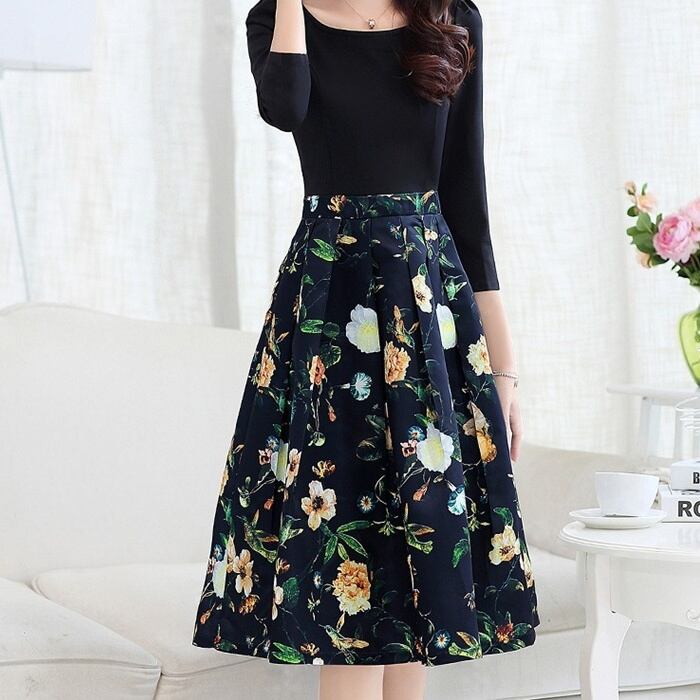 7分袖とフレアスカートの組み合わせは、女性らしさを引き立てます。