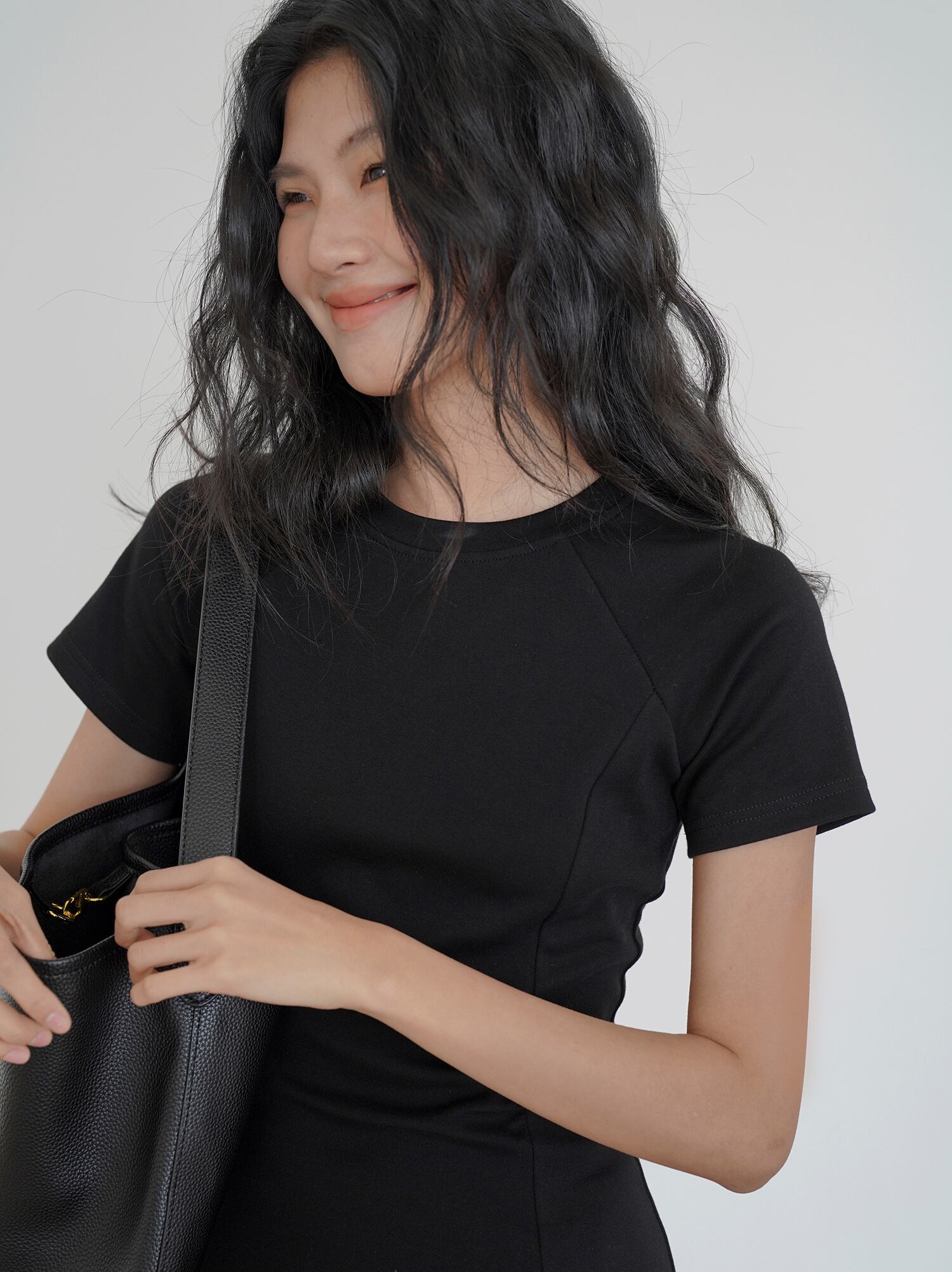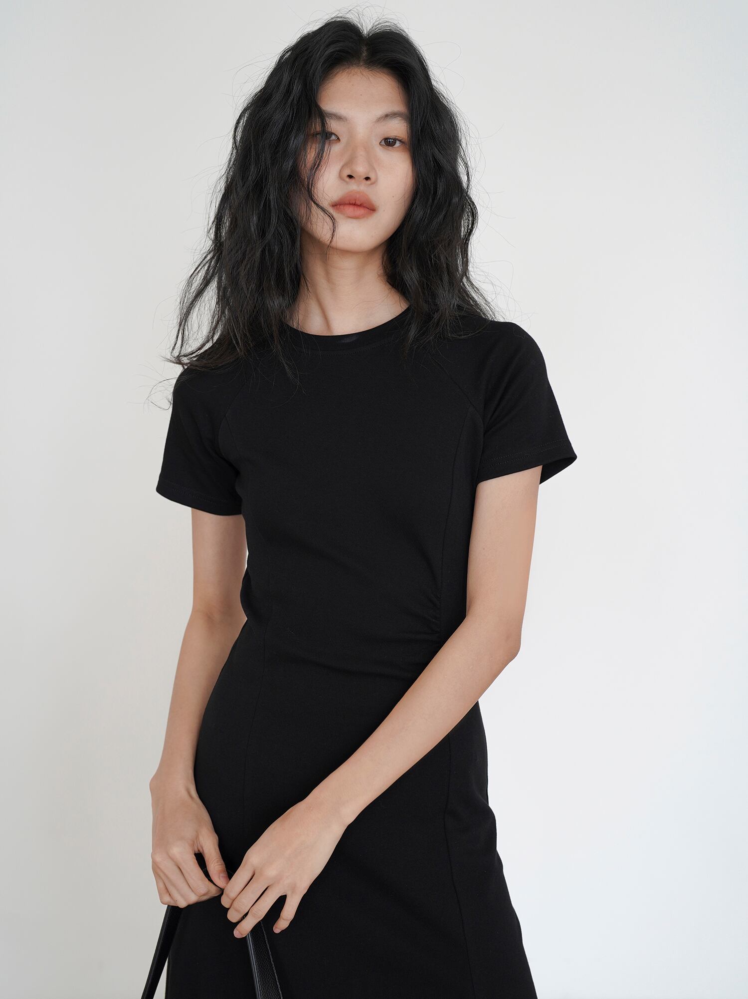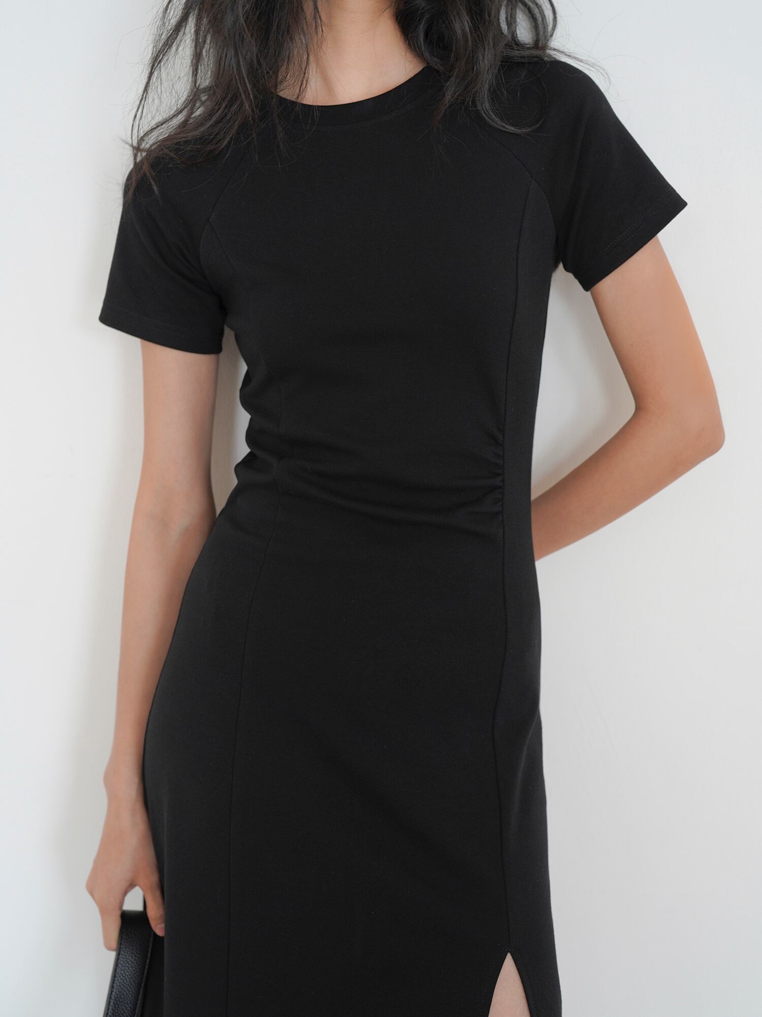 ワンピース ロングスカート ロング 半袖 ラウンドネック スリム スリット 中厚手 きれいめ シンプル カジュアル 上品 おしゃれ 無地 夏 お出かけ イベント コーデ 美脚 S M L ブラック