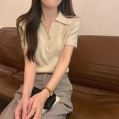 カジュアルな中にもきれいめな印象を与えるトップスが登場しました!このポロカラーの半袖トップスは、大人可愛い雰囲気で着こなしを引き締めてくれます。普段使いやオフィスコーデにもピッタリなシンプルなデザインで、様々なシーンで活躍してくれること間違いなし!夏の暑い日にも涼しく着られる薄手の素材で、快適な着心地を提供します。