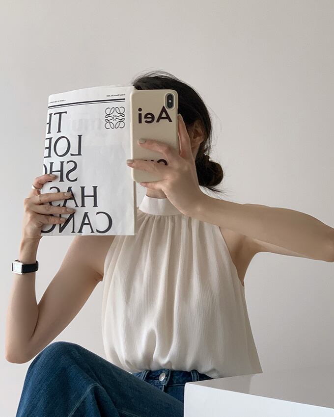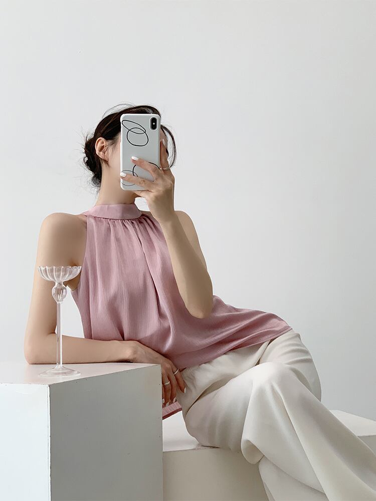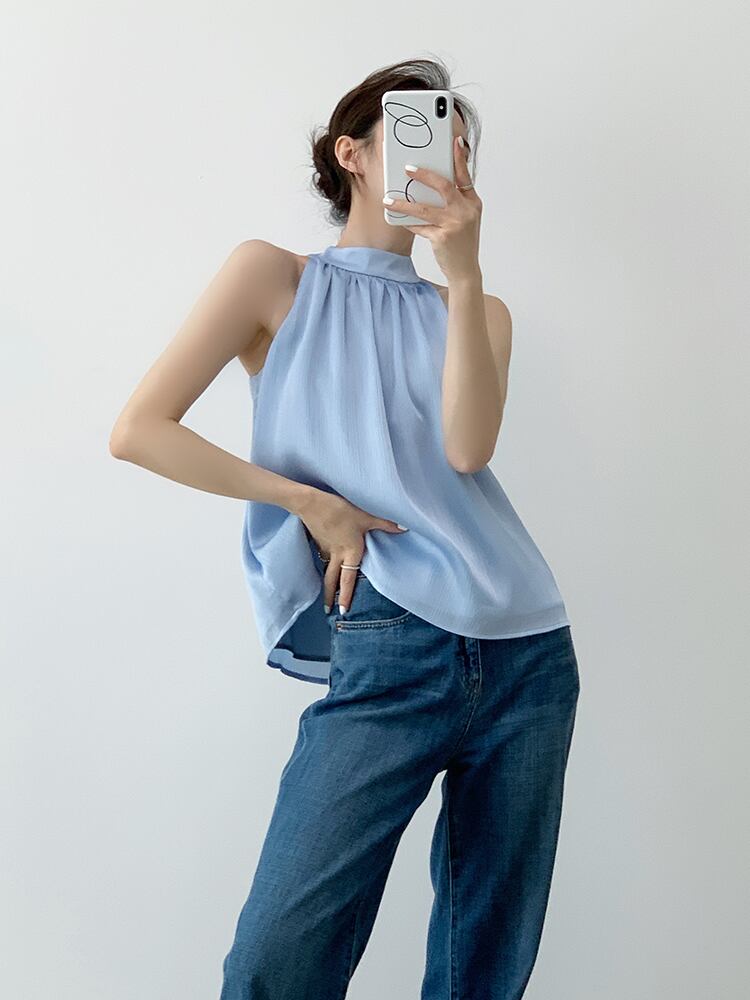 ふんわりとしたギャザー使いが可愛らしいノースリーブブラウス。ホルターネックデザインで背中の肌見せポイントも◎。シンプルながらも上品な仕上がりで、大人可愛いスタイルを演出してくれます。夏にぴったりな涼しい素材感で、S、Mサイズ展開というサイジングも嬉しいポイント。ホワイト、ブラック、ピンク、ブルーの4色展開で、お好みのカラーをお選びいただけます。季節感満載のインスタ映えコーデにぴったりな、一枚は持っていたいアイテムです。