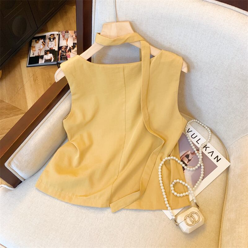 レディース トップス ベスト 袖なし ノースリーブ スクエアネック ポケット ボタン かわいい 大人可愛い シンプル おしゃれ 無地 夏 S M L ホワイト ブラック イエロー