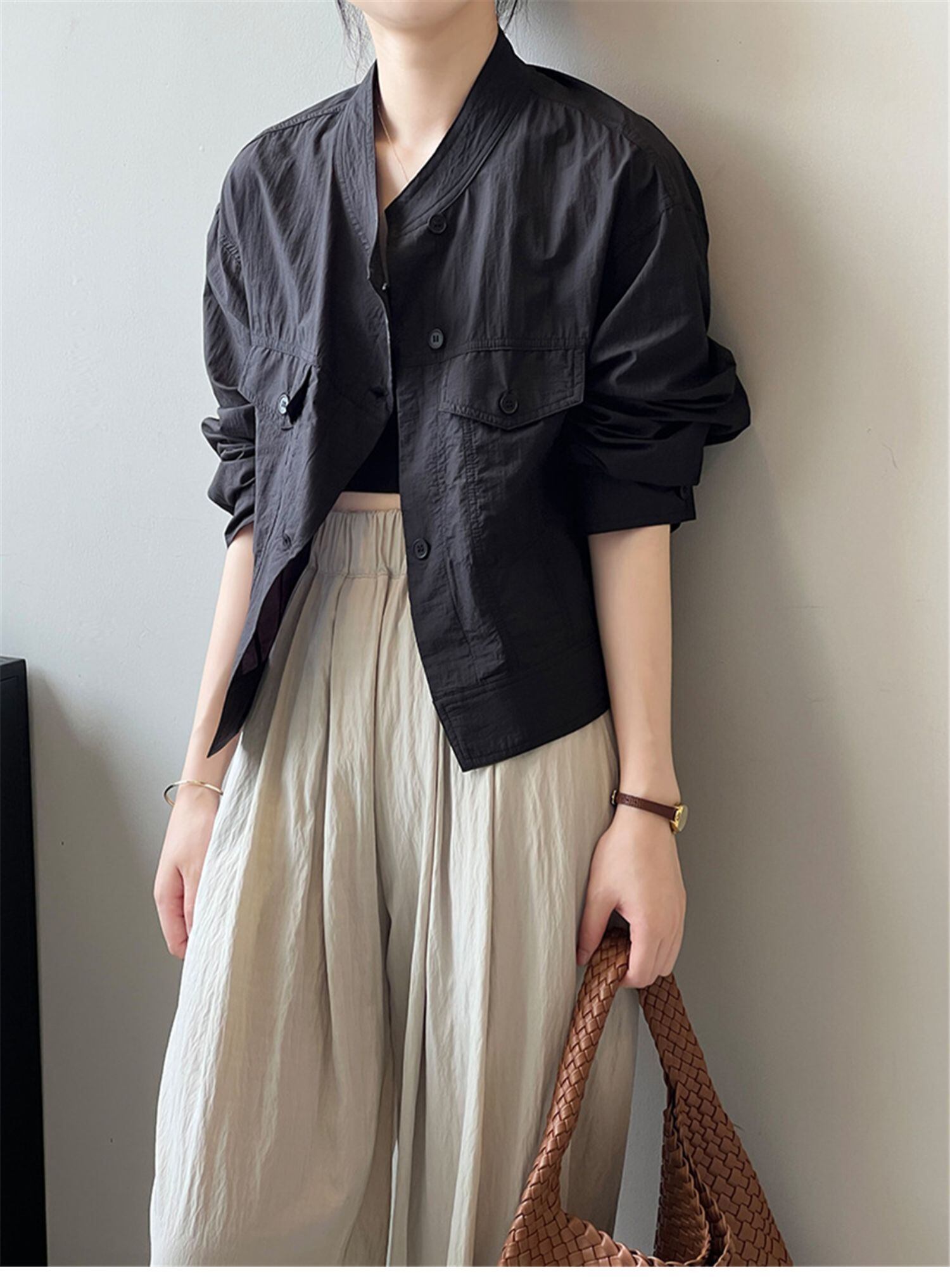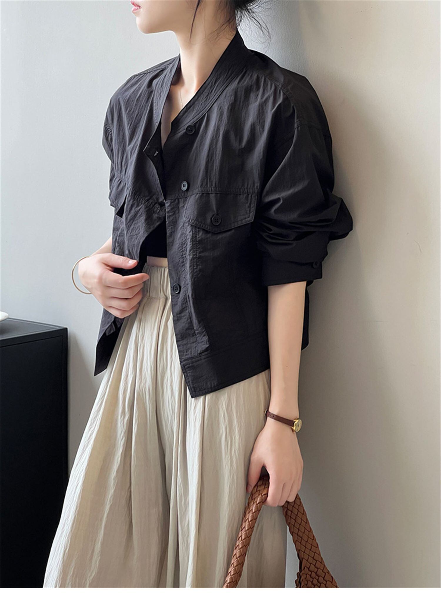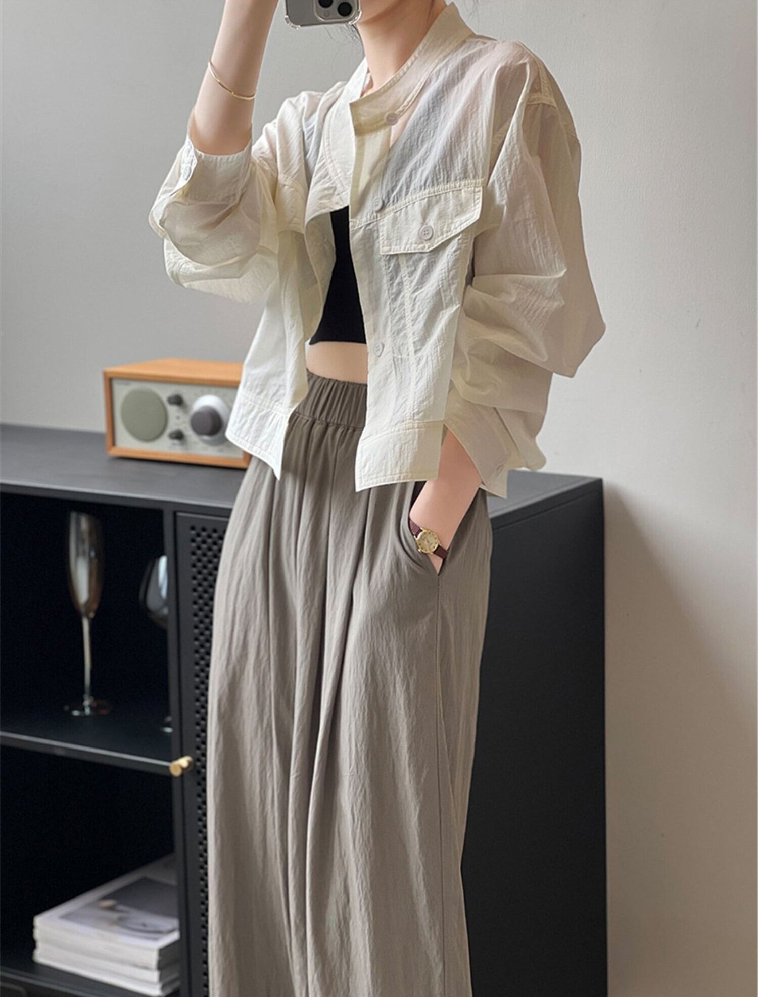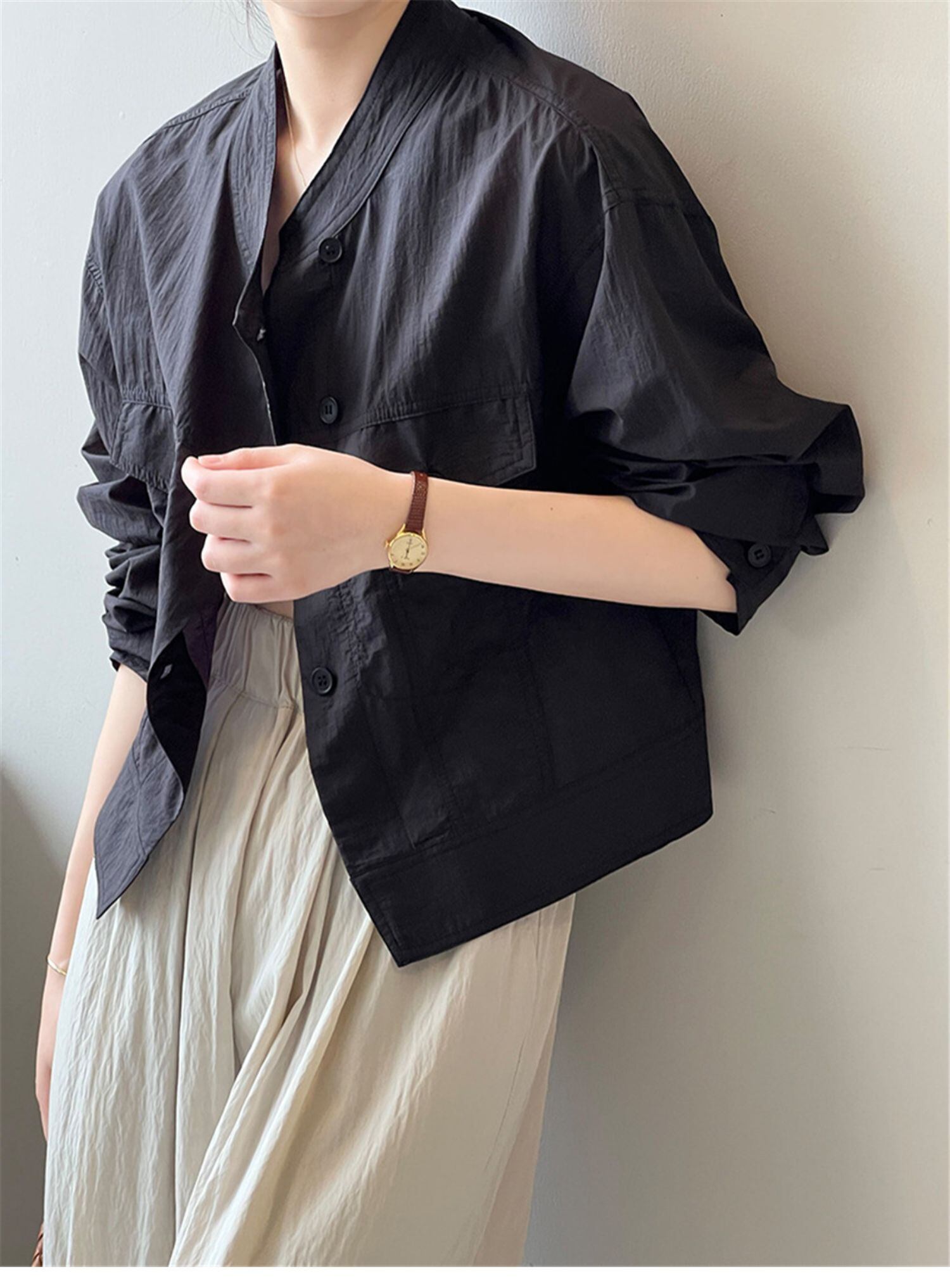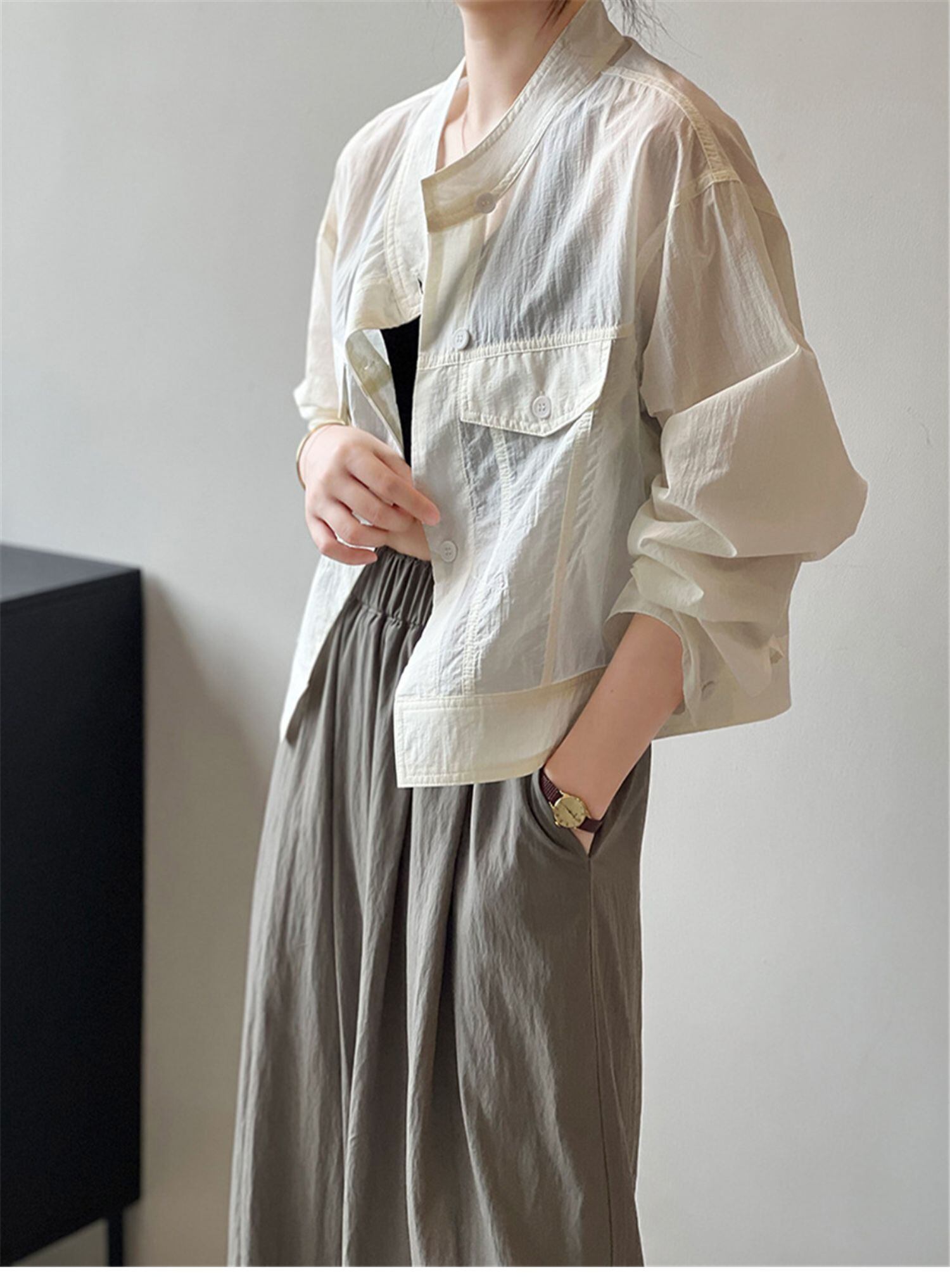 レディース トップス ジャケット シャツ 羽織 長袖 スタンドカラー 透け感 ボタン シワ感 かわいい 大人可愛い シンプル カジュアル おしゃれ かっこいい 無地 夏 ホワイト ブラック カーキ