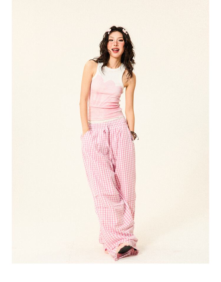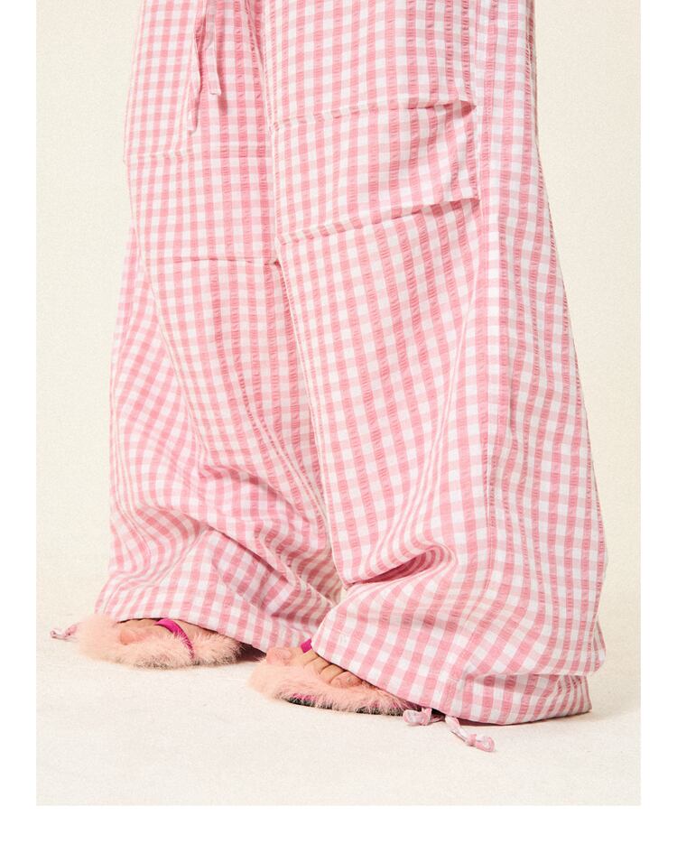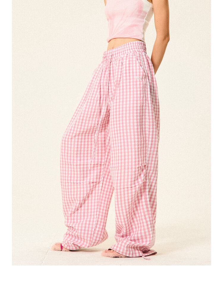 レディース パンツ ボトムス ワイドパンツ ロング ワイド 裾ワイド 薄手 かわいい カジュアル おしゃれ かっこいい ラフ 主役級 存在感 アメリカン チェック 夏 ピンク ブルー