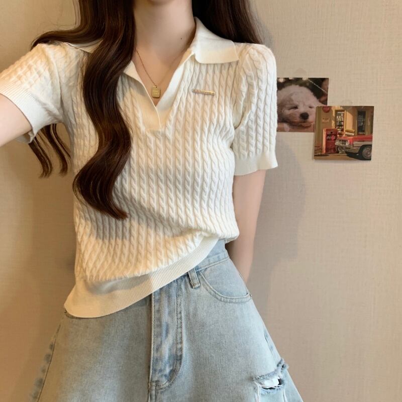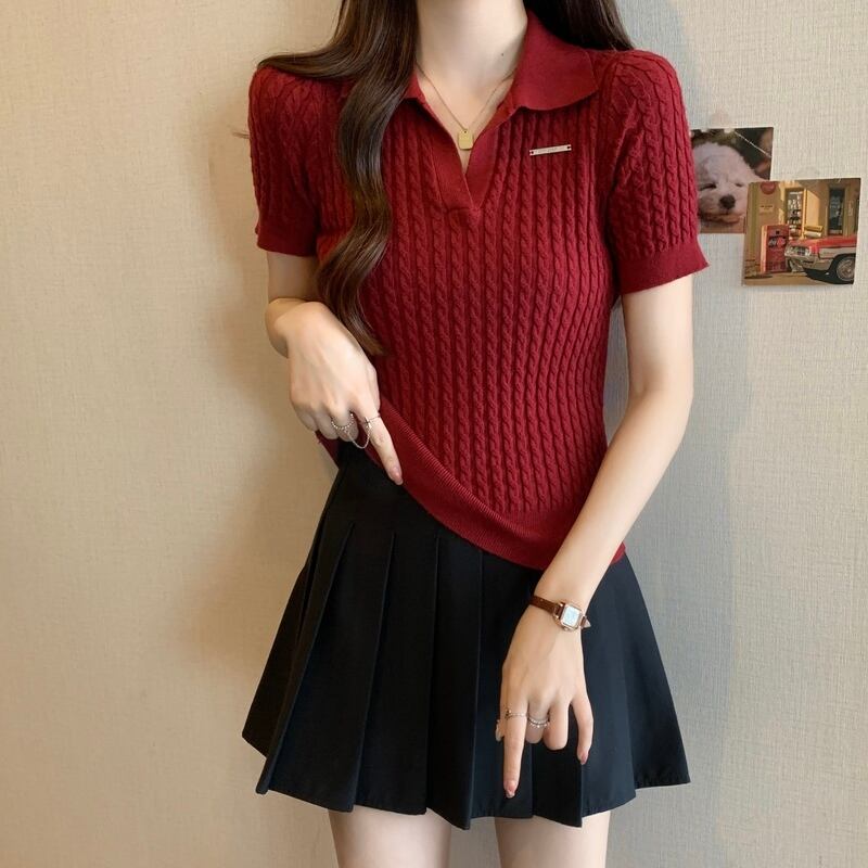 レディース トップス カットソー ニット 半袖 襟付き ポロカラー スリム 細身 ケーブルニット かわいい 大人可愛い きれいめ シンプル 上品 おしゃれ 無地 夏 ホワイト ブラック レッド