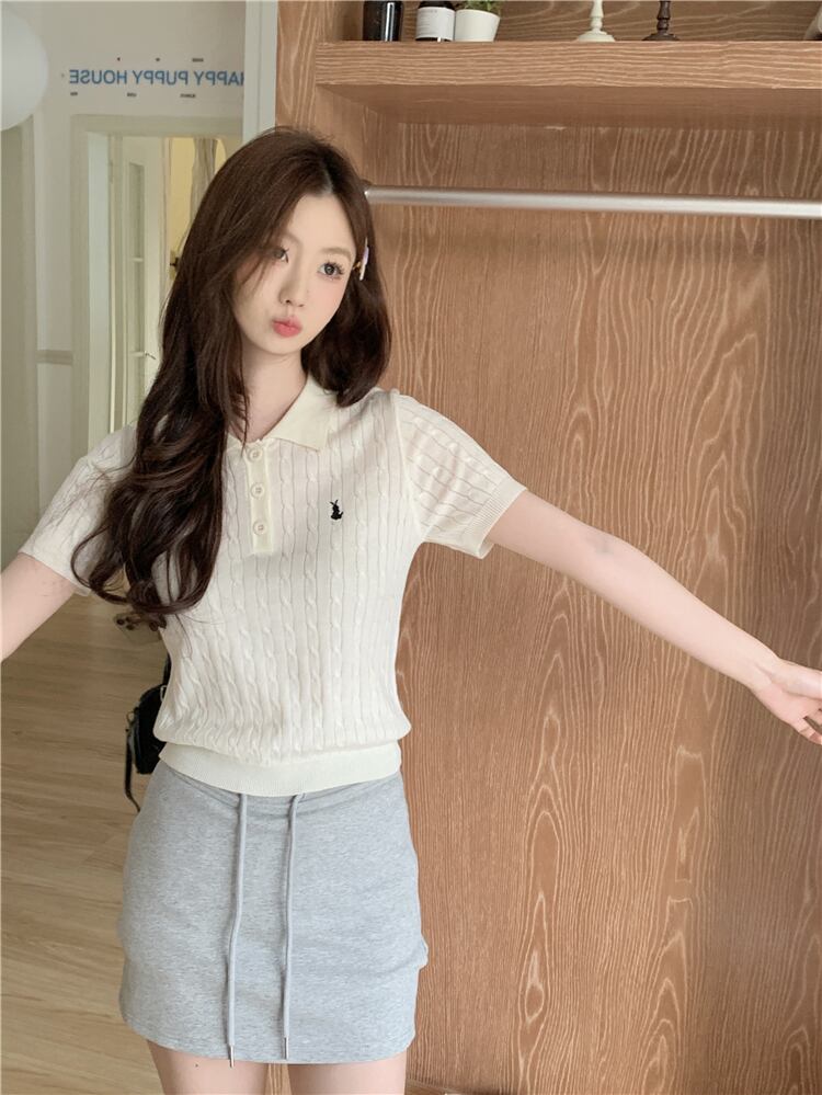 レディース トップス ニットポロシャツ 半袖 ポロカラー スリム 細身 ケーブルニット ワンポイント かわいい 大人可愛い シンプル 上品 おしゃれ 無地 ロゴ 夏 S M L XL ホワイト グレー