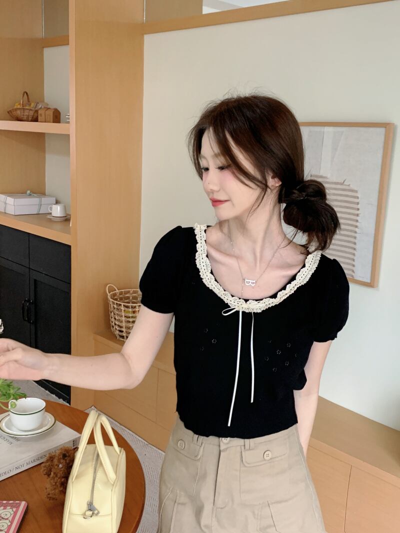 レディース トップス カットソー 半袖 ラウンドネック フリル リボン リブ 薄手 かわいい 大人可愛い きれいめ シンプル 上品 おしゃれ ガーリー 夏 黒 ブラック