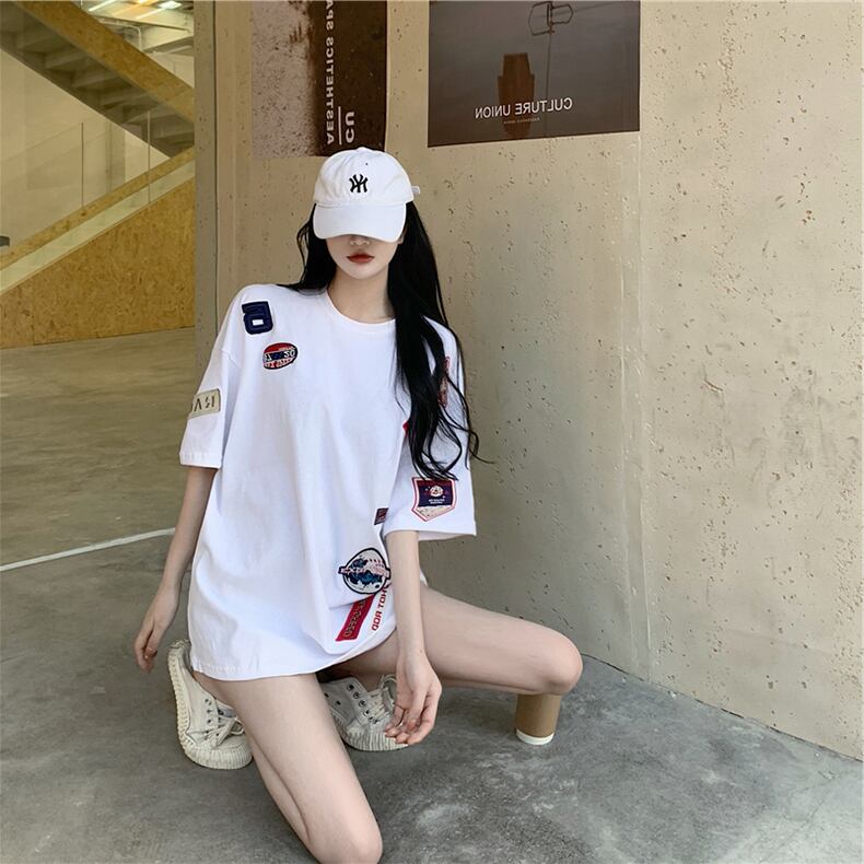 レディース トップス カットソー チュニック 5分袖 クルーネック ワイド かわいい カジュアル おしゃれ ラフ ルーズ プリント ワッペン 夏 S M L XL 2XL ホワイト ブラック