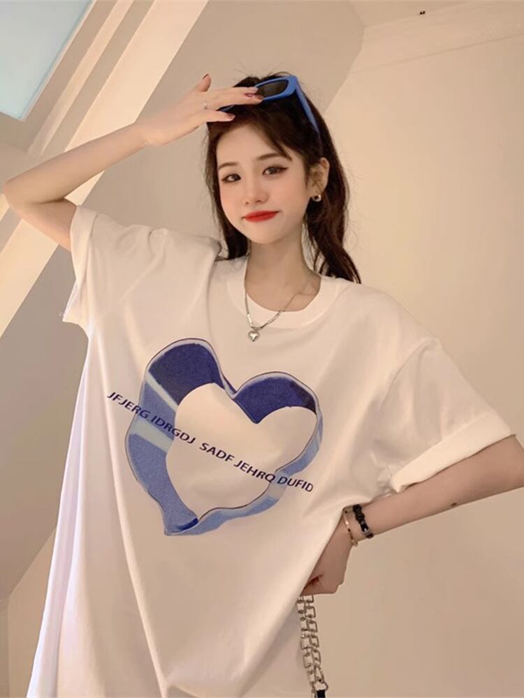 レディース トップス チュニック 5分袖 クルーネック ワイド かわいい シンプル カジュアル おしゃれ こなれ感 ラフ プリント ハート柄 夏 楽ちん S M L XL 2XL ホワイト