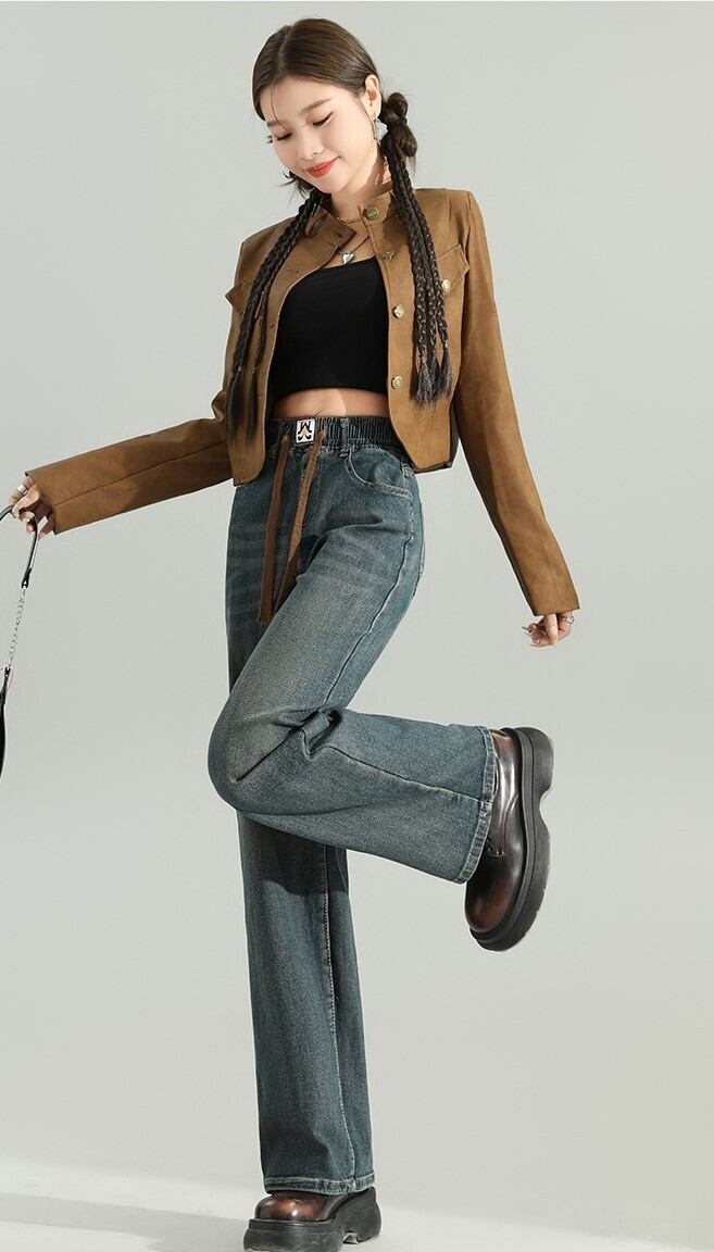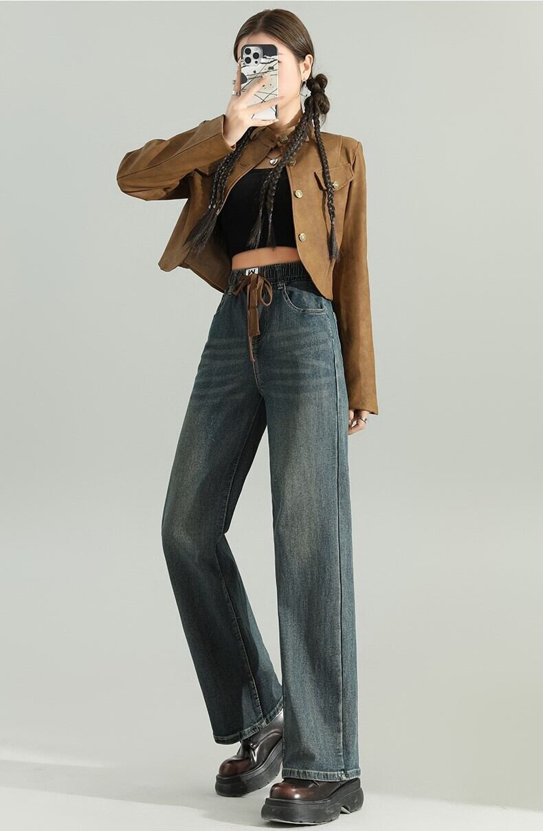 高いウエストラインにドローコードが付いた、シンプルでおしゃれなレディースデニムパンツの登場です。フルレングスでワイドストレートなシルエットが、スタイルアップ効果を演出します。ハイウエスト設計で脚長効果も抜群。