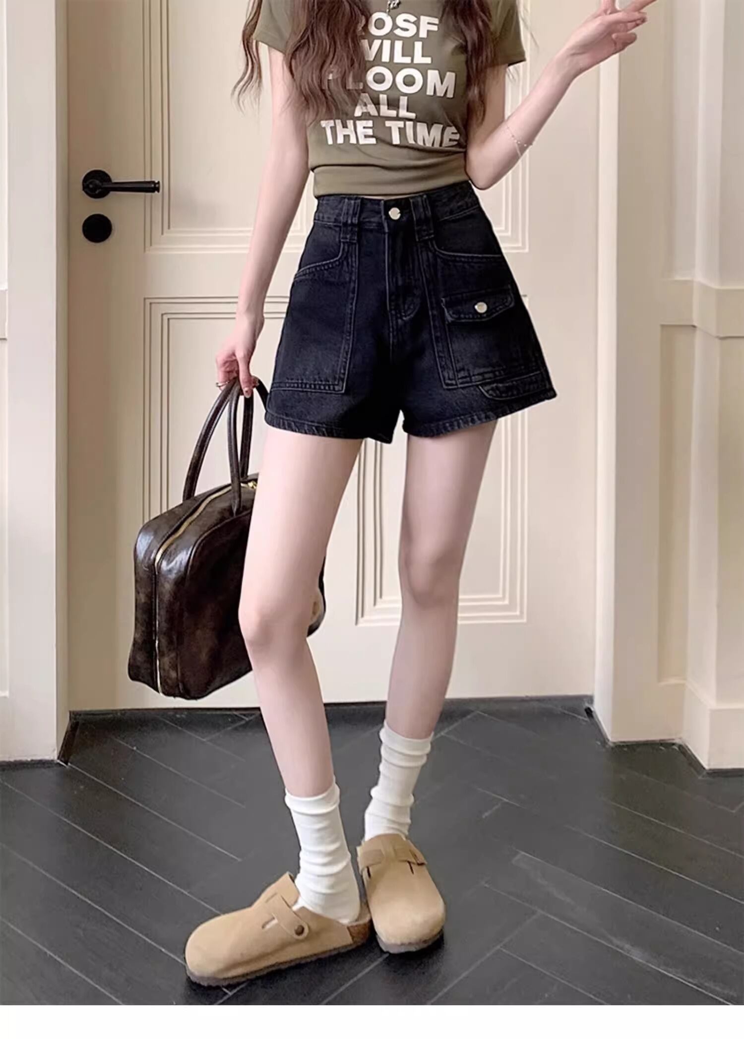 レディース パンツ ボトムス デニムパンツ ショート 膝上 ハーフ ポケット ハイウエスト デニム シンプル カジュアル おしゃれ かっこいい こなれ感 ラフ 無地 夏 ブラック ライトブルー