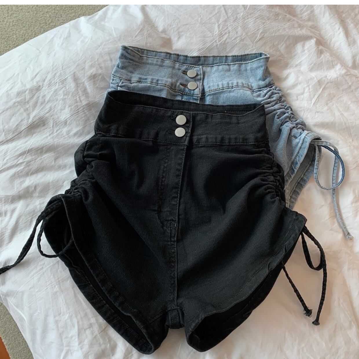 レディース パンツ ボトムス デニムパンツ ショート 膝上 ギャザー デニム カジュアル おしゃれ かっこいい 無地 夏 S M L XL 2XL 3XL 4XL 5XL ブラック ライトブルー