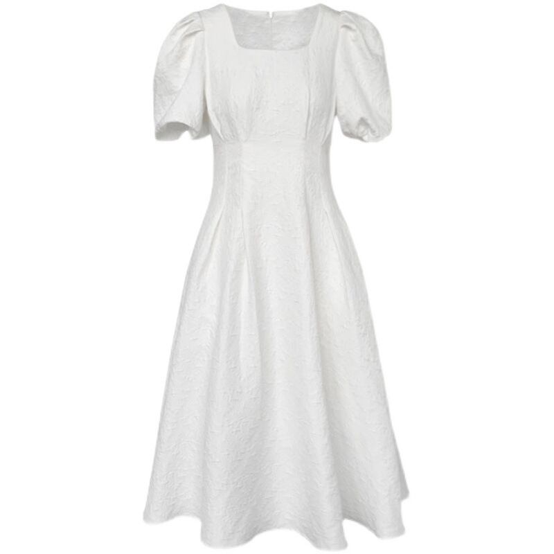レディース ワンピース ミディアム 膝上 ボリューム袖 パフスリーブ スクエアネック 細身 Aライン タック ハイウエスト かわいい 大人可愛い きれいめ シンプル 上品 おしゃれ ガーリー フォーマル 無地 デート お出かけ レストラン 体型カバー 清楚