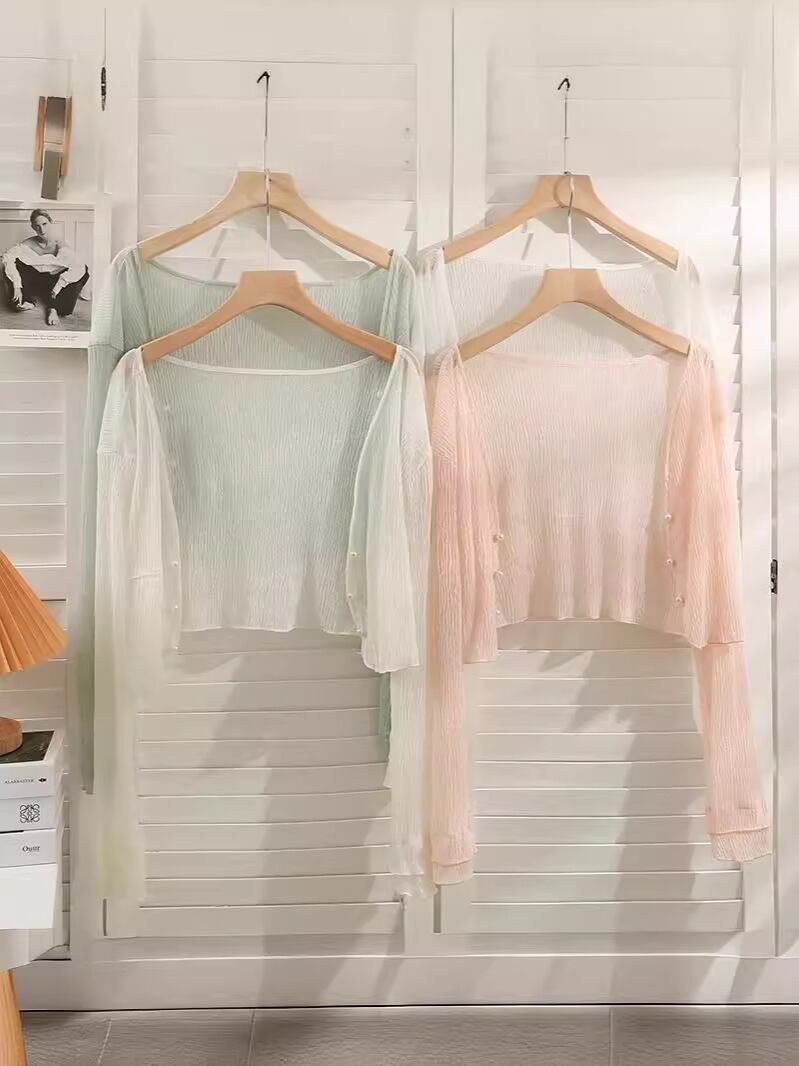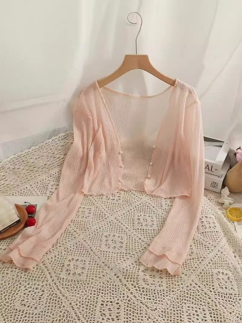 レディース トップス カーディガン ボレロ 前開き ショート フレアスリーブ 萌袖 Vネック フェミニン プリーツ シフォン 透け感 シースルー 薄手 シアー シンプル ガーリー 夏 秋 オフィス OL 学生 お出かけ 海 ビーチ 普段使い 着回し 定番