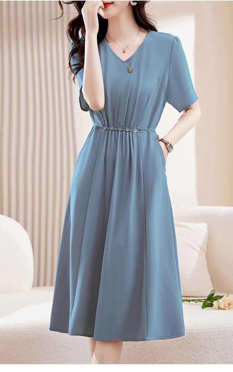 レディースのための上品で可愛らしいワンピースが新登場!Vネックのデザインが女性らしさを引き立て、Aラインとハイウエストのシルエットが美しいボディラインを演出します。さらに、半袖なので夏の暑い日でも快適に着用できます。色はピンク、ブルー、レッド、グリーンとバリエーション豊富にご用意しております。