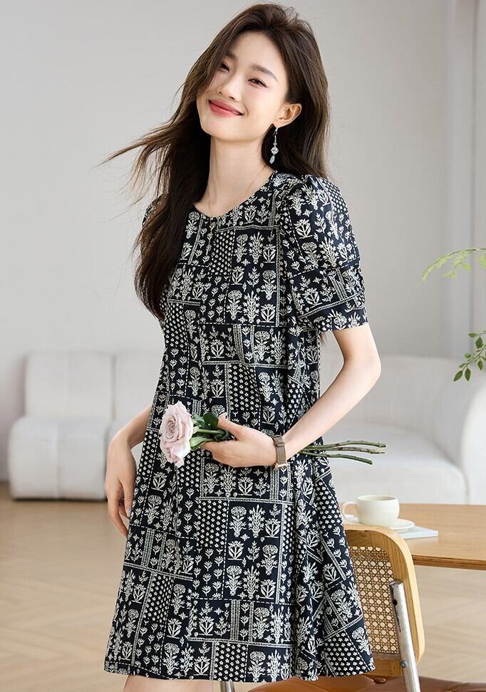 レディース ワンピース ショート 半袖 Aライン ハイウエスト かわいい 大人可愛い きれいめ カジュアル おしゃれ 主役級 存在感 総柄 夏 M L XL 2XL 3XL ブラック