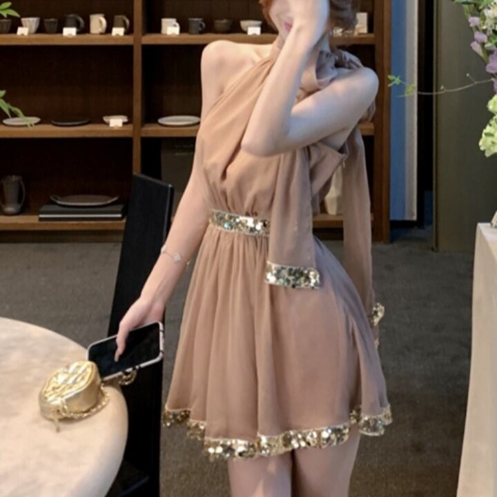 ノースリーブのホルターネックで華奢見えするデザインは、フレアのAラインが美しいシルエットを演出します。バックコンシャスなリボンとスパンコールが、大人可愛い印象を与える一着です。二次会やパーティー、イベントなど様々なシーンで活躍する、おしゃれで上品なワンピースです。