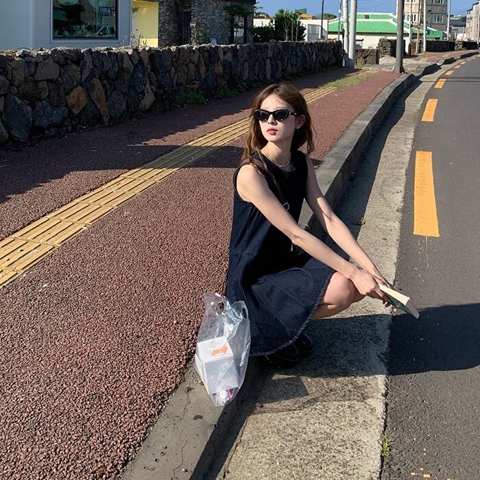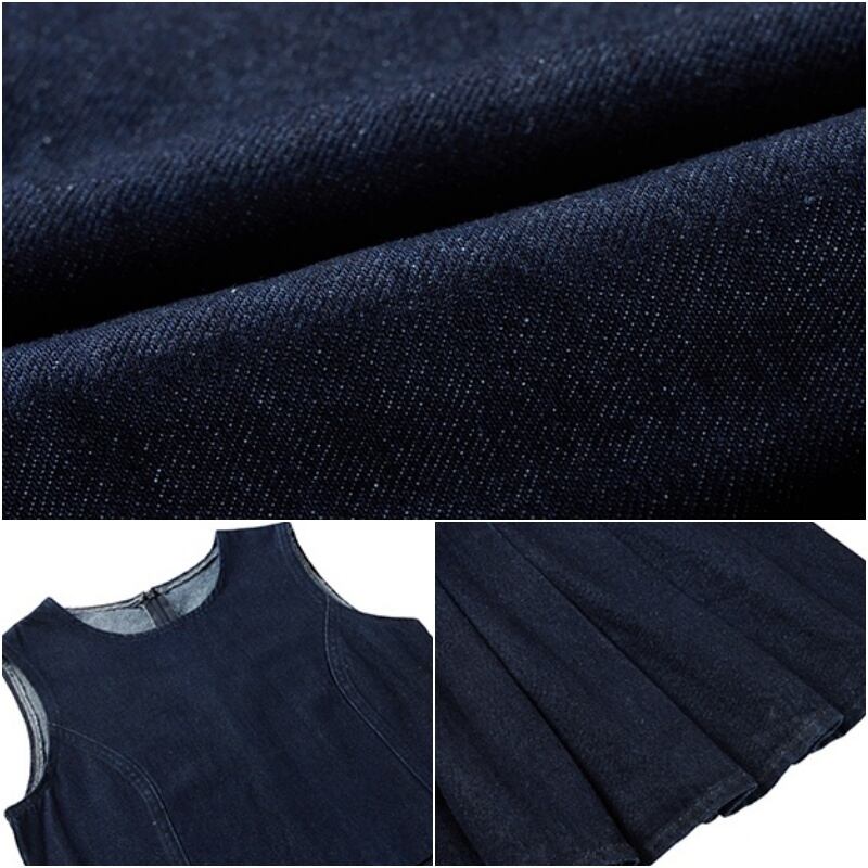 レディース ワンピース ミニ ノースリーブ ラウンドネック Aライン プリーツ ハイウエスト デニム シンプル カジュアル 無地 通学 デート お出かけ 旅行 海 休日 ショッピング S M L ブルー