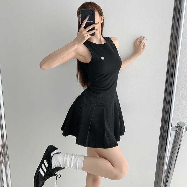 クールでスポーティーなレディースワンピース。クルーネックとノースリーブのデザインが斬新で、フレアAラインとプリーツが女性らしさを引き立てます。シンプルな無地で、どんなシーンでも活躍すること間違いなし。お出かけや旅行、公園や休日、ショッピングなど、様々な場面で使える便利なアイテムです。