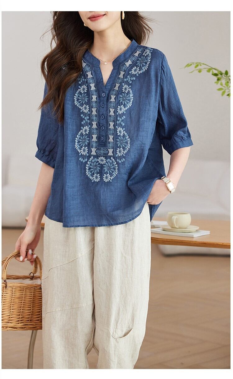 レディース トップス シャツ ブラウス プルオーバー 5分袖 ヘンリーネック 刺繍 ボタン 薄手 大人可愛い シンプル カジュアル おしゃれ こなれ感 夏 ピンク オレンジ ネイビー