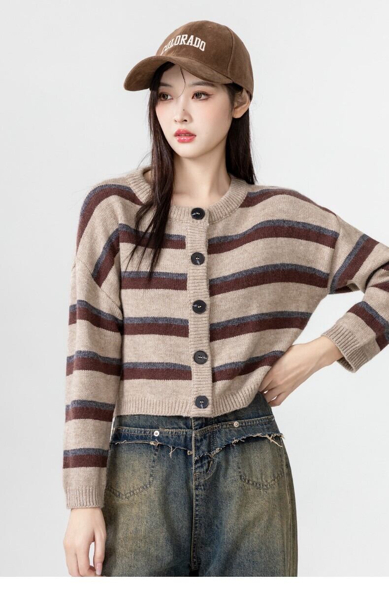 レディース トップス ニット カーディガン 前開き ショート 長袖 ラウンドネック 2way ボタン 切り替えデザイン 配色 かわいい シンプル カジュアル レトロ ラフ ボーダー 春 秋 通勤 通学 お出かけ 休日 普段使い 着回し ゆったり ゆる
