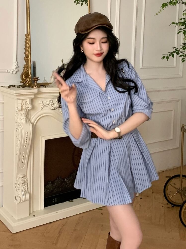 レディース ワンピース シャツワンピ ミニ 長袖 襟付き スリム Aライン プリーツ ベルト付き 大人可愛い シンプル カジュアル おしゃれ ストライプ お出かけ お泊まり ショッピング S M L ブルー