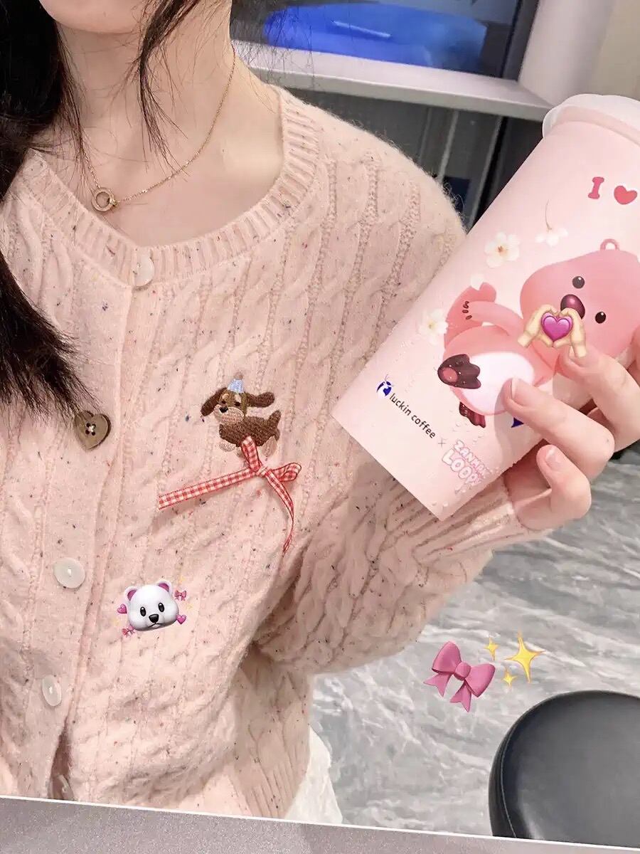 レディース トップス セーター カーディガン 長袖 Uネック 刺繍 リボン ふっくら 編み上げ 中厚手 かわいい ガーリー ラブリー キュート くま柄 秋 デート イベント 女子会 カフェ