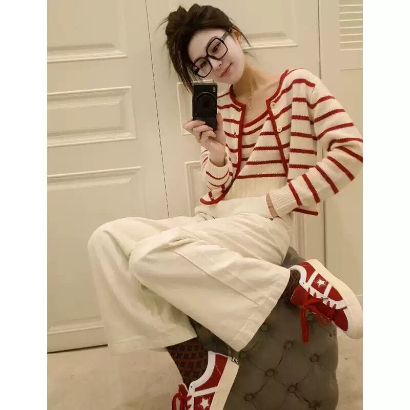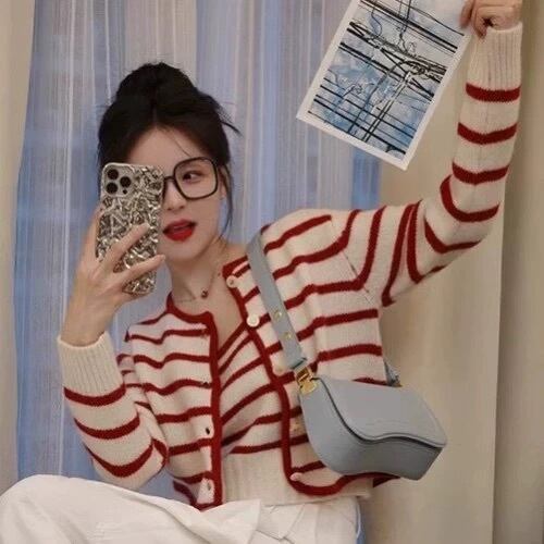レディース トップス セーター カーディガン 長袖 Uネック 前開き ボタン 中厚手 大人可愛い シンプル カジュアル 個性的 存在感 ボーダー 秋 デート お出かけ 公園 休日 重ね着