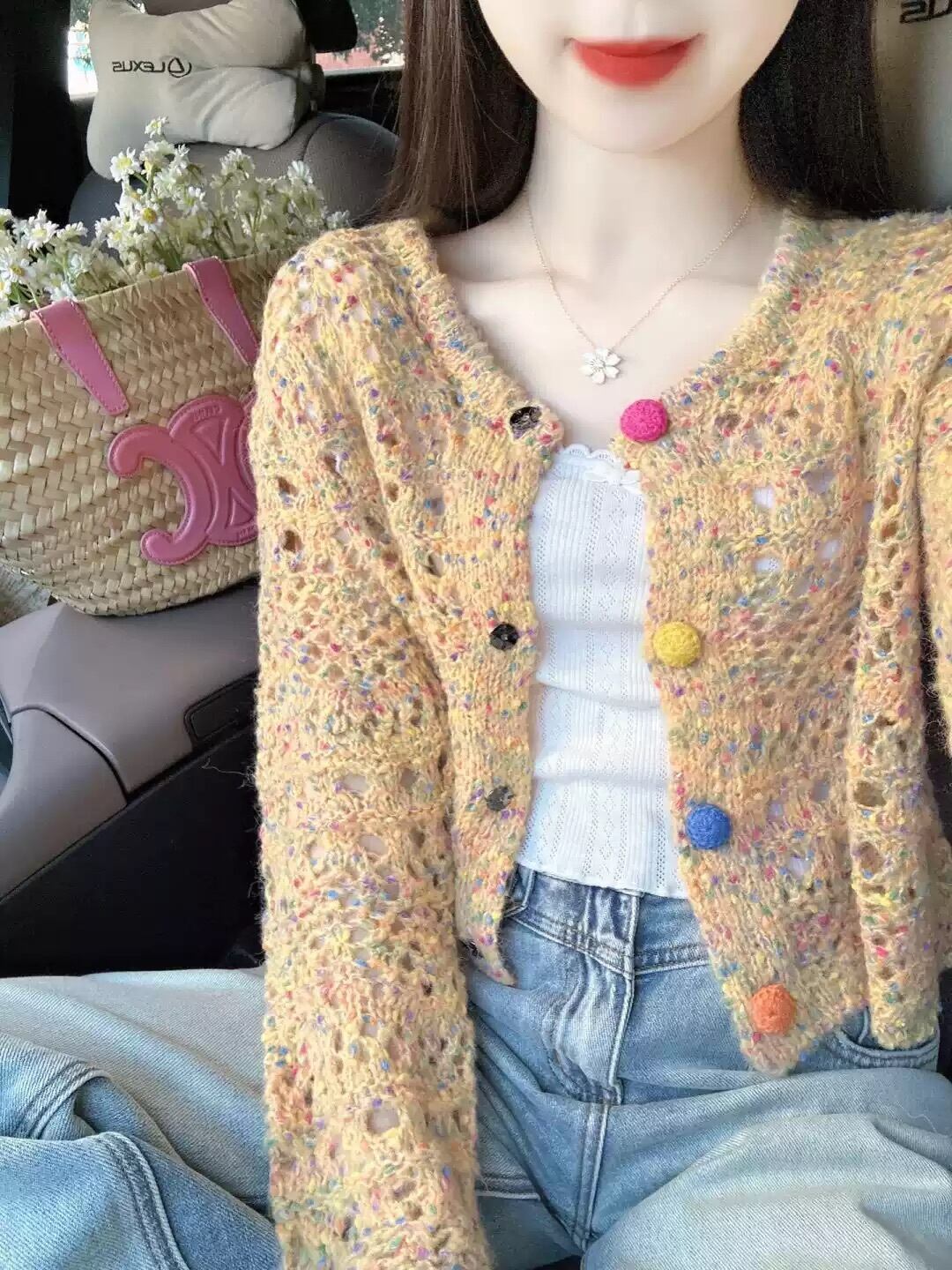トップス 羽織 前開き クロップド丈 長袖 Uネック 前開き 編み込み ボタン 中厚手 ニット 大人可愛い カジュアル 秋 デート お出かけ 公園 重ね着 普段使い レイヤード 黄色