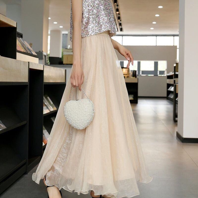 ふんわりと広がるフレアシルエットが魅力のロングスカート。エレガントなAラインデザインで、体型をさりげなくカバーしつつ、美しいシルエットを演出します。軽やかなシフォン素材に透け感があり、上品で女性らしい印象をプラス。ウエストゴム仕様でリラックスした着心地。お出かけや旅行、お泊まりなど、さまざまなシーンで活躍します。