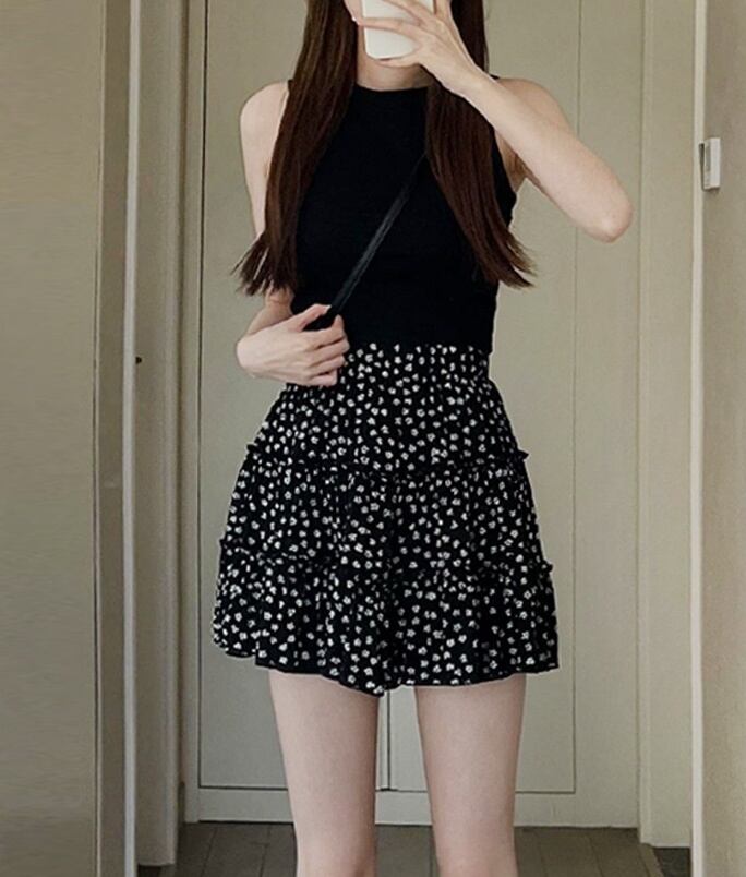レディース スカート ミニスカート ミニ Aライン シフォン ハイウエスト ウエストゴム かわいい 花柄 お出かけ お泊まり ショッピング 普段使い 着回し S M L XL 白 ホワイト 黒 ブラック